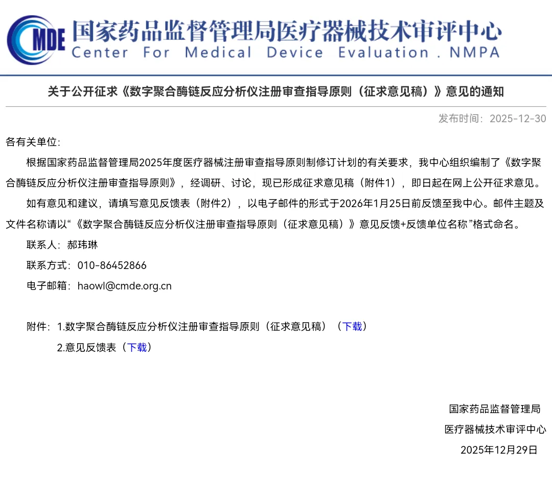 关于公开征求《数字聚合酶链反应分析仪注册审查指导原则(征求意见稿)》意见的通知