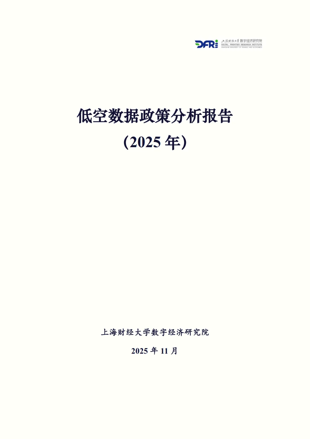 《低空数据政策分析报告(2025年)》是上海财经大学数字经济研究院于2025年11月发布的专业研究报告,核心围绕低空经济发展中的数据要素治理展开,是国家“十五五”规划中“加快低空经济集群发展”战略导向下的重要研究成果。