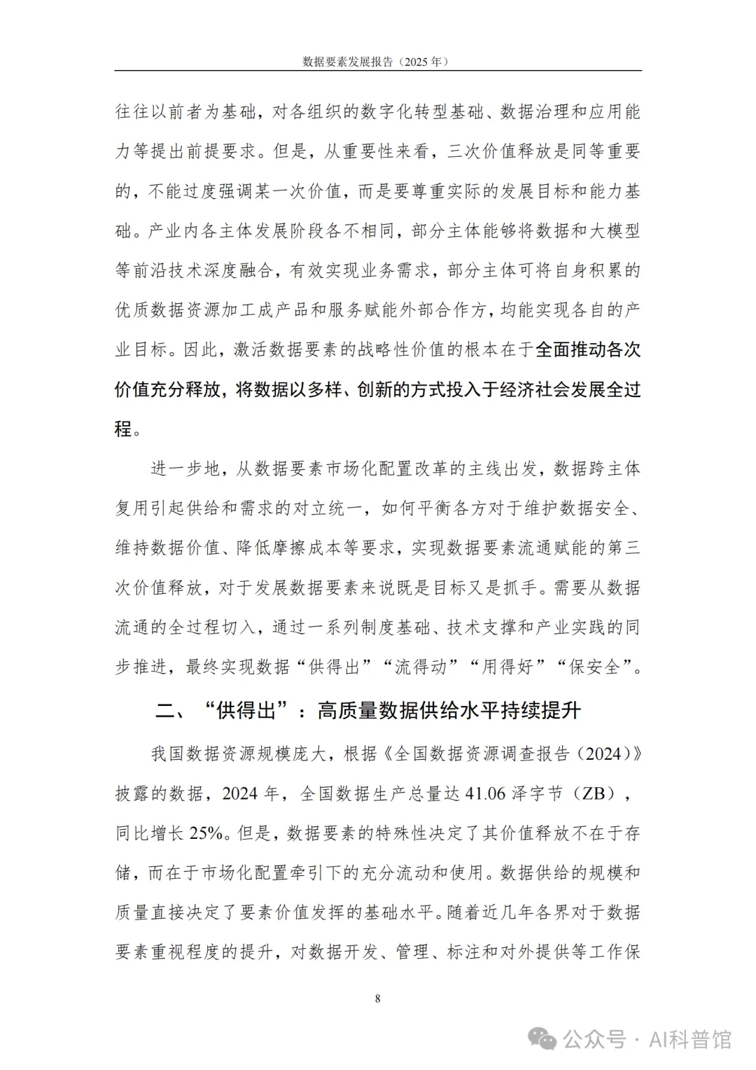 立足党的二十届三中全会及2025年政府工作报告相关部署,数据作为关键生产要素的战略价值愈发凸显。中国信息通信研究院发布的《数据要素发展报告(2025年)》系统梳理我国数据要素在供给、流通、应用、安全领域的最新动态,为推动数据“供得出、流得动、用得好、保安全”提供指引,助力数字中国建设与中国式现代化推进。