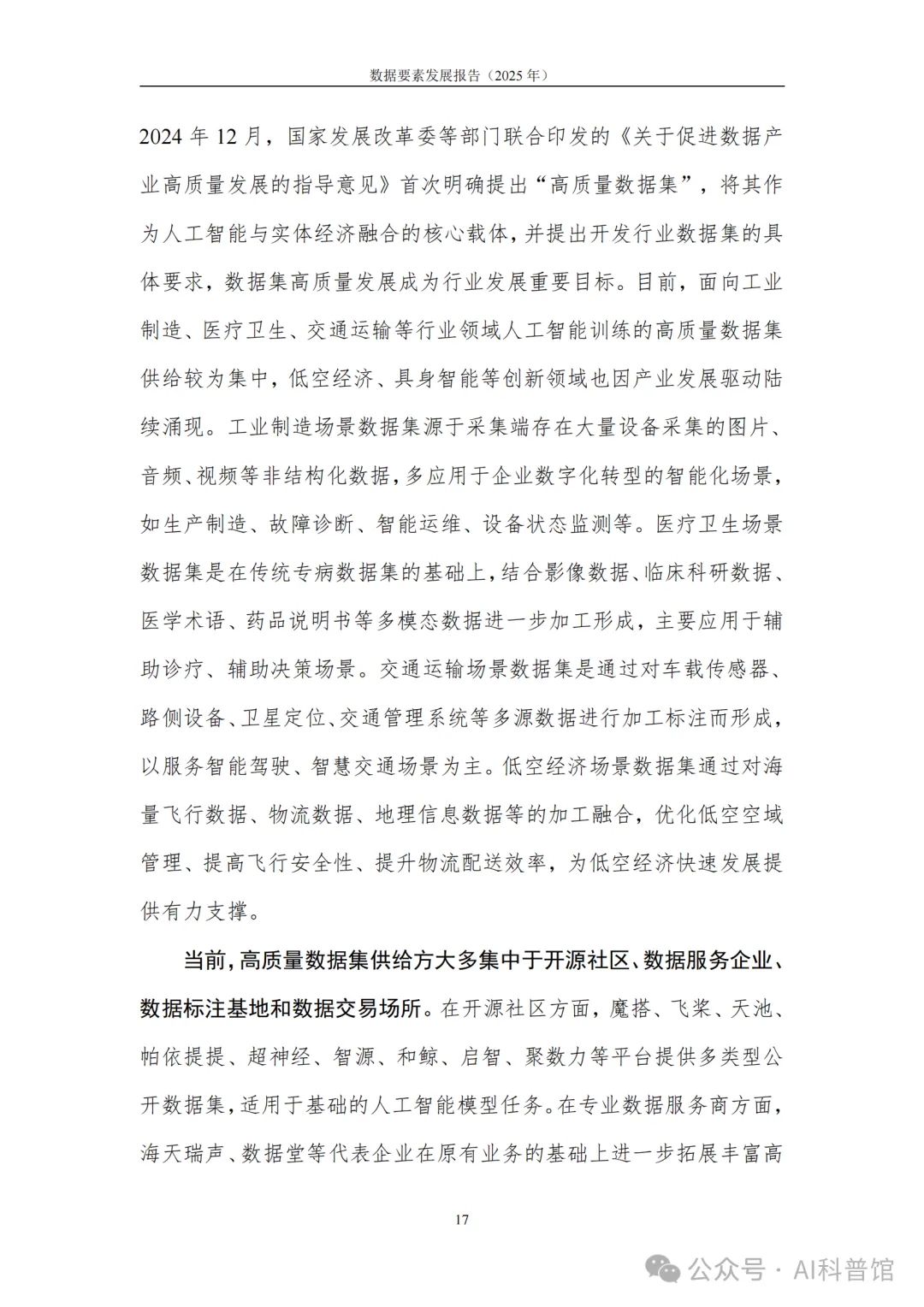 •产业:工业制造、医疗、低空经济等领域加速建设高质量数据集,开源社区、专业服务商等构成多元供给生态。
