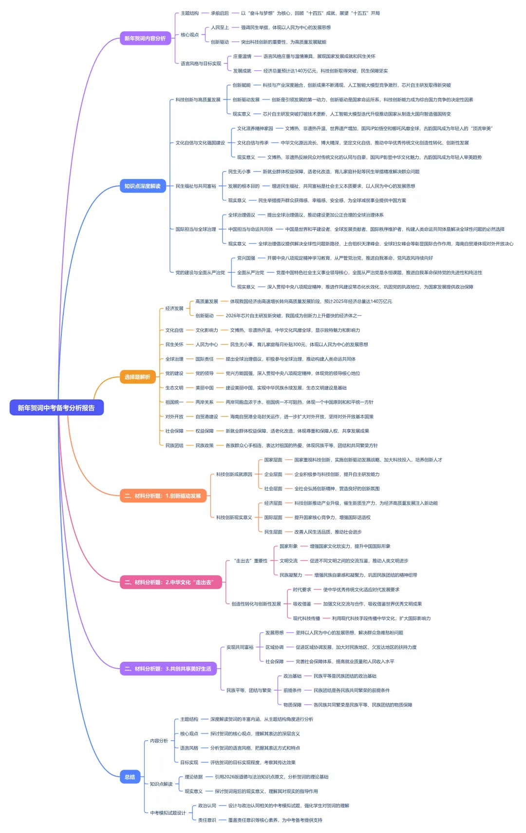 本次任务完成了对2026年新年贺词的深度分析与中考模拟试题设计,涵盖了内容分析、知识点解读和出题训练三个部分。内容分析从主题结构、核心观点、语言风格和目标实现三个维度,全面解读了贺词的丰富内涵;知识点解读大量引用2026版道德与法治知识点原文,深入分析了贺词背后的理论依据和现实意义;中考模拟试题紧密贴合河北省中考要求,覆盖了政治认同、责任意识等核心素养,为中考备考提供了有力支持。