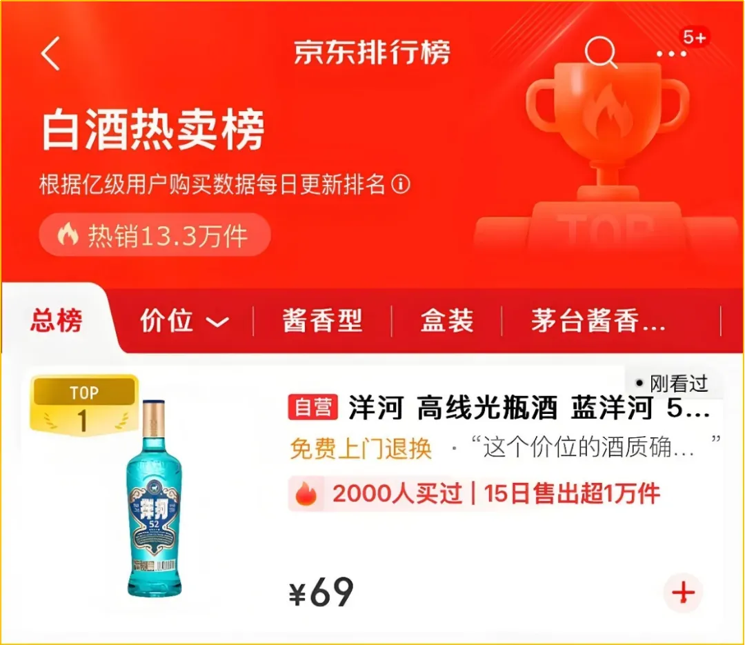 例如:洋河大曲高线光瓶定价59元,略高于玻汾(55元)但低于泸州老窖黑盖(65元),卡位“次高端光瓶”。