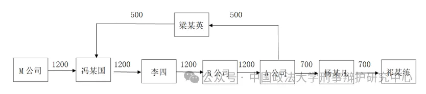 2018年11月21日,M公司向冯某国转账1200万元,同日,冯某国将1200万元转给犯罪嫌疑人李四,李四收款后转B公司,再由B公司转给A公司。同日,A公司分两笔将资金转出,其中一笔700万元转给杨某凡,杨某凡当天转给祁某练700万元;另一笔500万元转给梁某英,梁某英当天转给冯某国500万元。至此,1200万元回流到F公司控制的账户上。