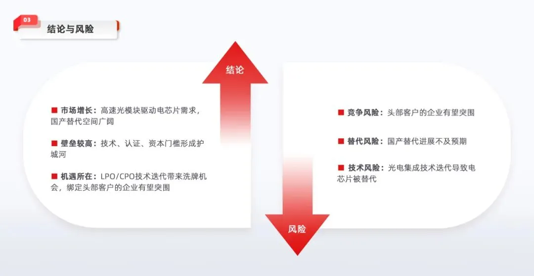 同时,报告中也指出,高速光模块电芯片行业的发展面临铜缆连接方案竞争、国产替代不及预期、光电芯片技术更迭等风险,需要注意相关影响。