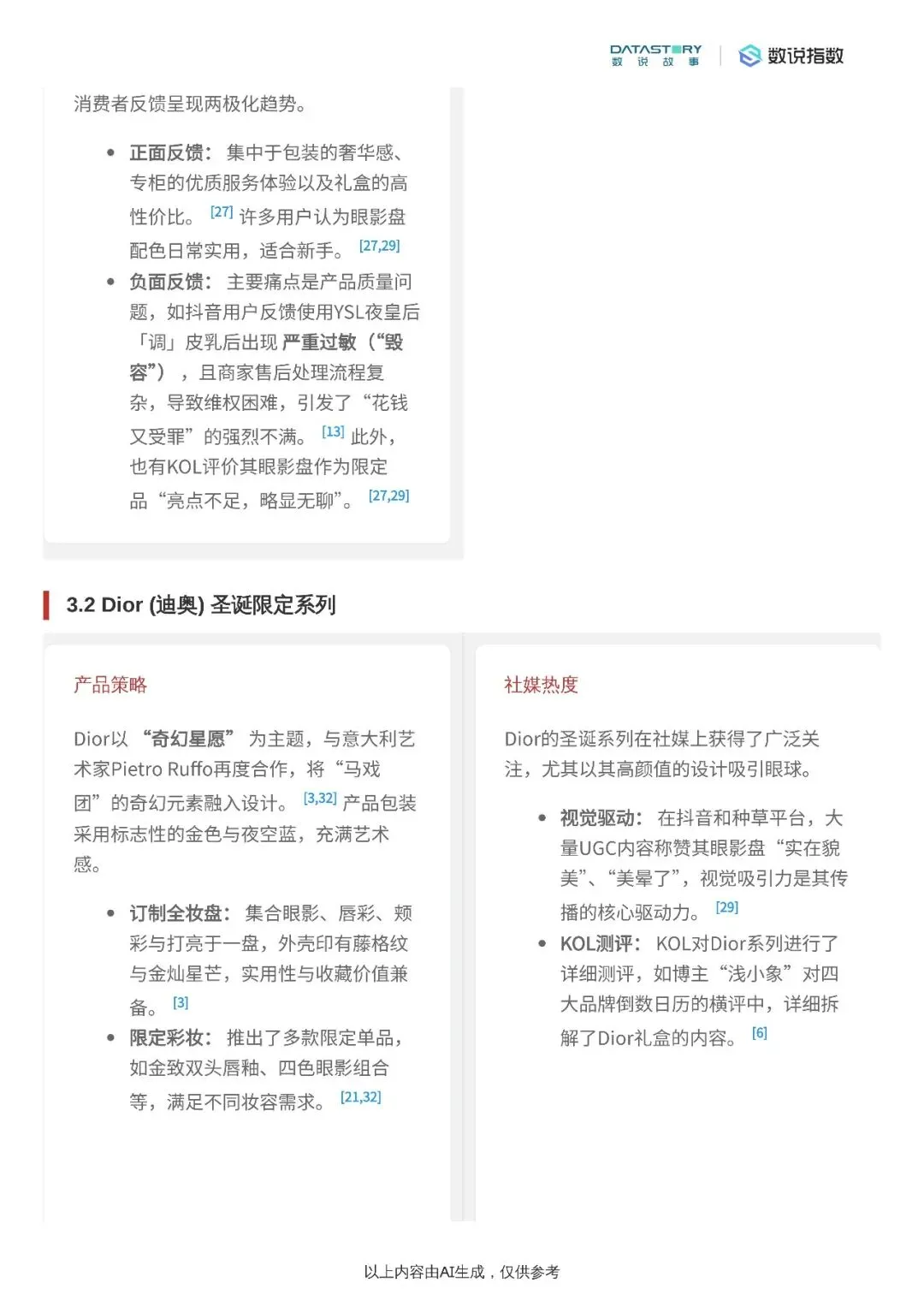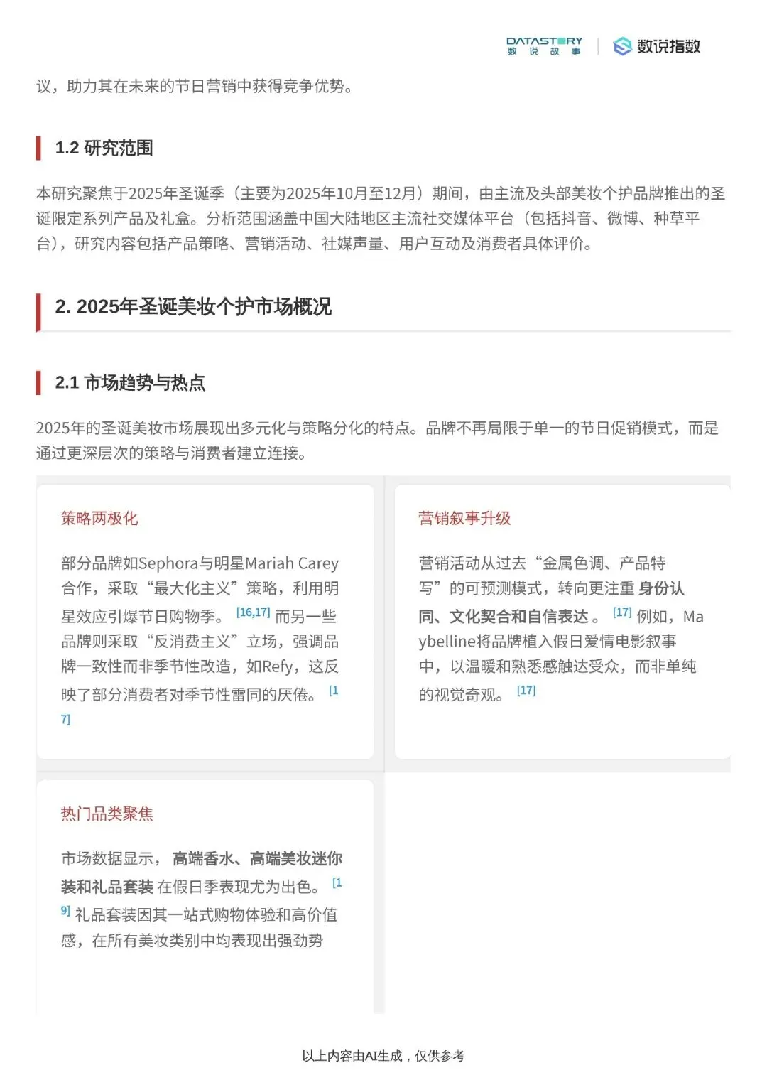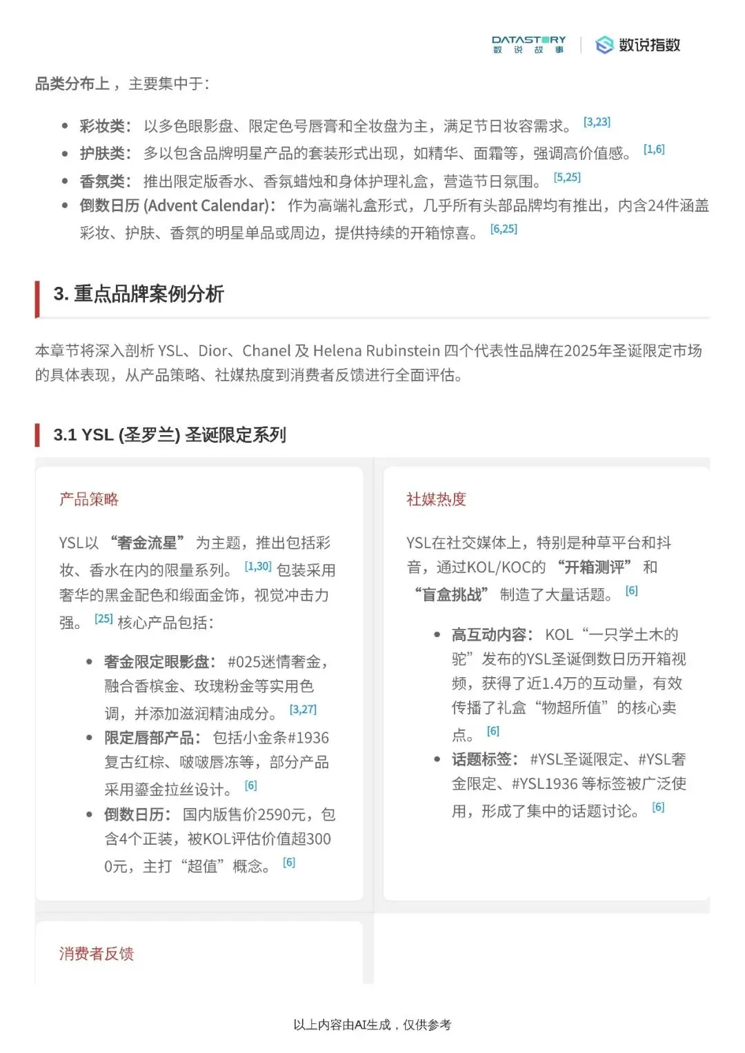2025年圣诞美妆个护限定产品市场呈现出⾼度的节⽇效应和社交媒体驱动的消费特征。头部品牌如YSL、Dior、Chanel及Helena Rubinstein等,通过 创新的包装设计、明星产品组合和情感化营销 ,成功捕获了⼤量消费者关注。社交媒体,尤其是抖⾳和种草平台,已成为品牌营销和消费者互动的核⼼阵地,其中“开箱”视频和产品深度测评等内容形式备受欢迎,极⼤地影响了消费者的购买决策。 [11,15]社媒数据显⽰,相关话题在11⽉底⾄12⽉中旬达到讨论⾼峰,圣诞节后热度迅速消退,时效性极强。