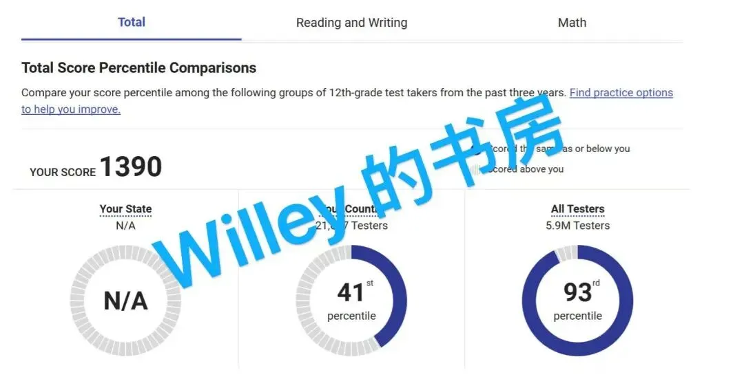 同时,中国学生1390分的排名是41%,换句话说,有将近60%参加SAT考试的中国学生都可以达到1400+分的成绩。