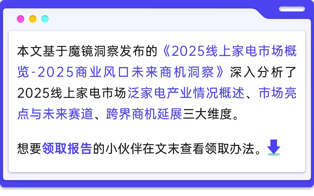 以上就是《2025线上家电市场概览-2025商业风口未来商机洞察》分析报告,篇幅有限,获取完整版报告欢迎公众号后台回复“领取报告”获取。