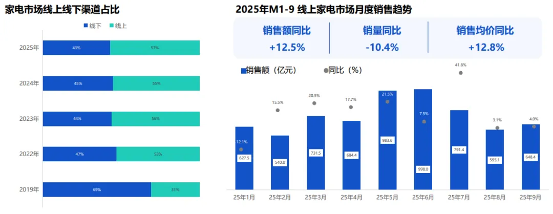2025年家电渠道格局逆转,线上占比升至57%成主导,规模同比小幅增至6600亿元。消费线上化、直播/VR构建信任、大促价格优势是核心推手;线下转型“体验中心”,线上线下融合消费成主流。
