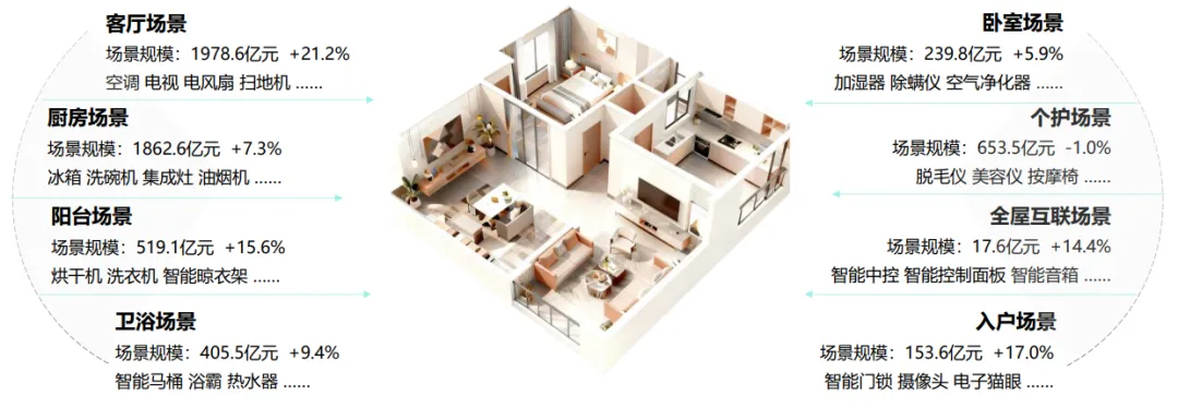 家庭场景是家电消费核心,呈现“核心扩容、细分崛起”特征。客厅、厨房市场规模分别达1978.6亿、1862.6亿,智能电视、嵌入式厨电巩固其地位。阳台(洗烘一体机驱动)、入户(智能门锁带动)增速分别达15.6%、17%,场景细分是品牌破局关键。