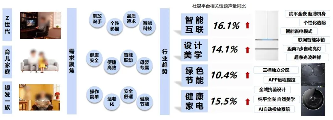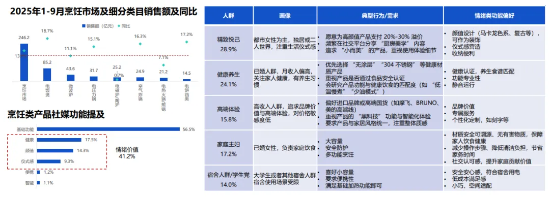 健康功能带动烹饪家电增长,低油、除菌成标配,空气炸锅、蒸烤箱渗透率提升。不同人群对情绪卖点需求不同,Z世代重颜值、中年重效率、银发族重便捷。