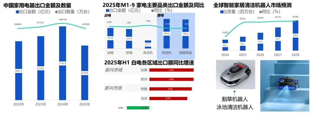 家电出海从“传统品类”转向“创新品类”,智能清洁电器成新增长点。传统白电在新兴市场稳增,割草、泳池清洁机器人等靠技术壁垒获高利润。头部品牌布局海外研发与供应链,实现“品牌出海”,海外营收占比提升。