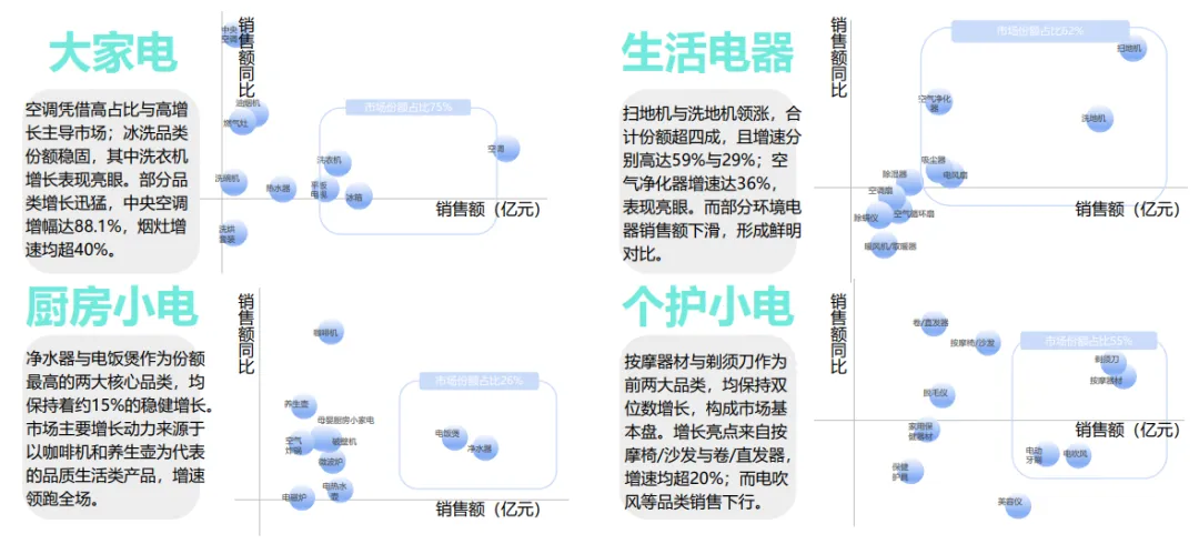 家电品类整体向智能、舒适升级,但增长动能分化。大家电中空调主导,中央空调增速88.1%,冰洗靠高端化与换新稳增;厨房小电咖啡机增速49.2%,健康类成引擎;生活电器扫地机、洗地机合计份额超四成;个护小电保持双位数增长。成熟品类靠结构升级,新兴品类靠需求渗透增长。