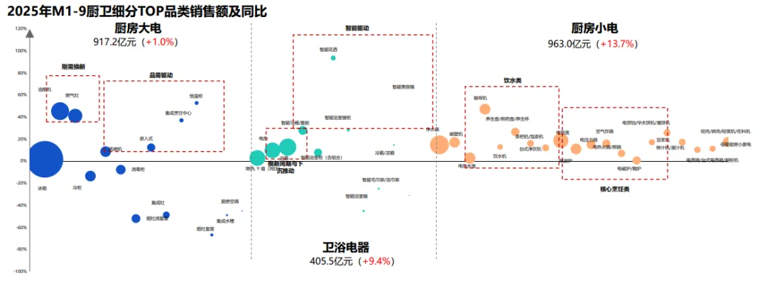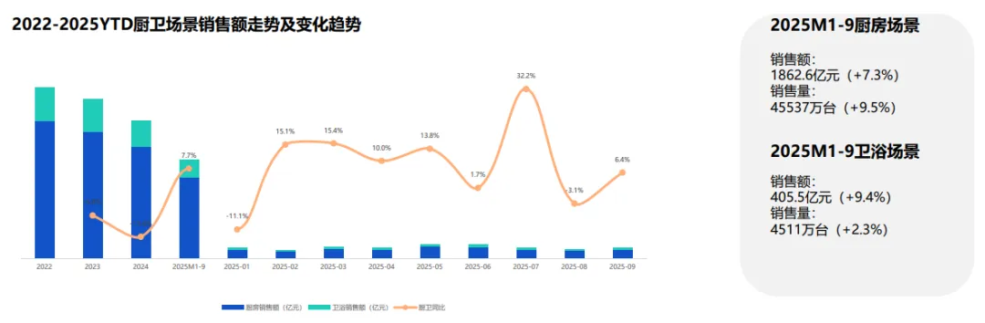 国补拉动厨卫家电量价齐升,前三季度销售额2268亿元,同比增长7.6%。高端嵌入式、智能厨电增速超20%,基础烟灶靠补贴普及。消费者需求转向品质,推动产品高端化与普及化并行。