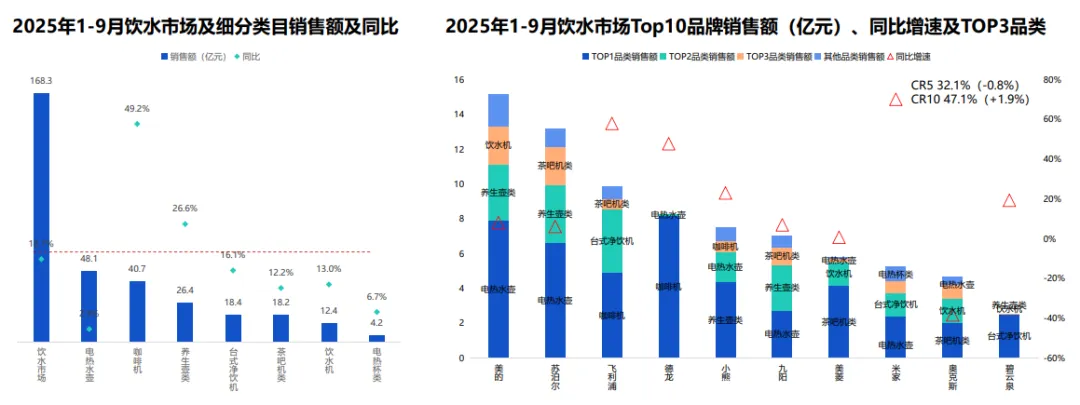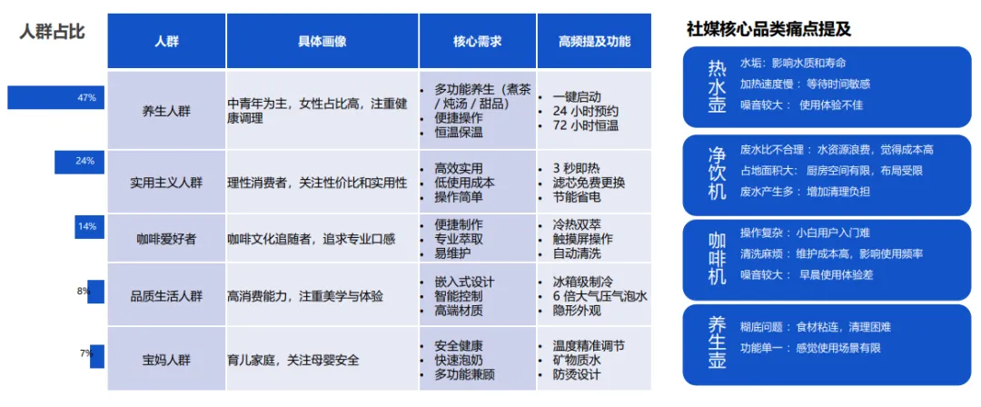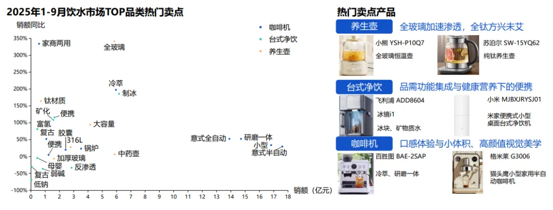 饮水市场成小家电黑马,咖啡机、养生壶领跑。市场向享受型、健康便捷化升级,台式净饮机、即热饮水机增速走高。