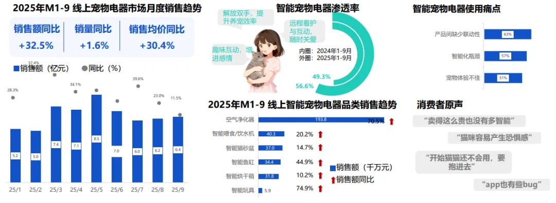智能宠物电器前三季度线上销售额58.9亿元,同比增32.5%,核心品类覆盖饮食、健康需求。互联差、同质化是痛点,生态融合与体验优化成竞争关键。
