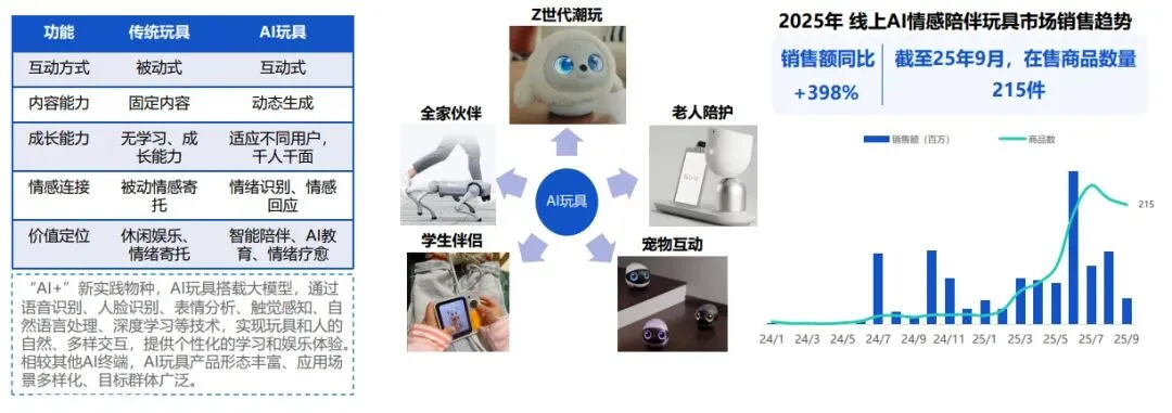 AI玩具开辟情感陪伴蓝海,儿童类销售额增近4倍。借助AI实现智能陪伴与启蒙,需求延伸至成人、老人,为家电品牌带来新增长空间。