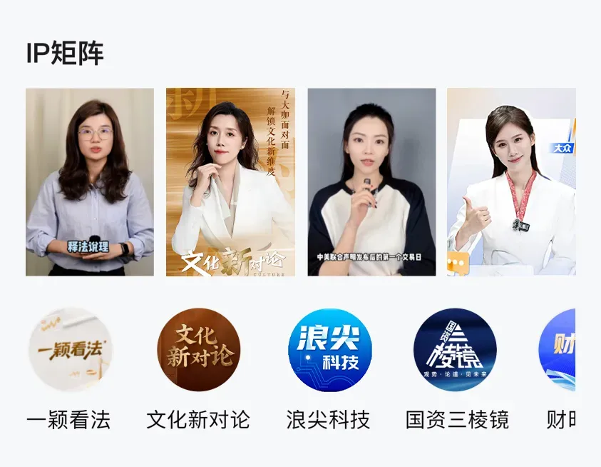 目前,大众号入驻用户形成了政务、市县、教育、政法、党建、V-IP、青春、银龄、金融、交通、健康、影像、美术、传媒、国企、达人号等16个垂直矩阵。通过拓展内容生产体系的实用价值,为用户创造了社交认同感。