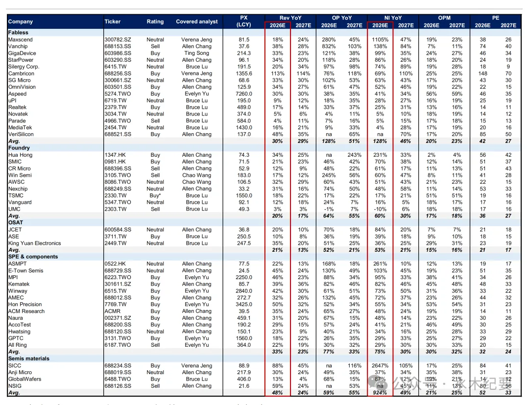 我们预计覆盖范围内的中国半导体材料企业 2026 年营收同比增长率将维持在 59%(主要由碳化硅(SiC)衬底和半导体晶圆驱动),其次是无晶圆厂半导体企业(同比增长 44%)、半导体设备企业(同比增长 32%)以及晶圆代工厂 / 整合器件制造商(IDM)/ 外包半导体封装测试企业(同比增长 23%)。
