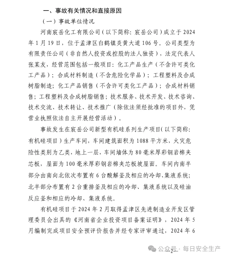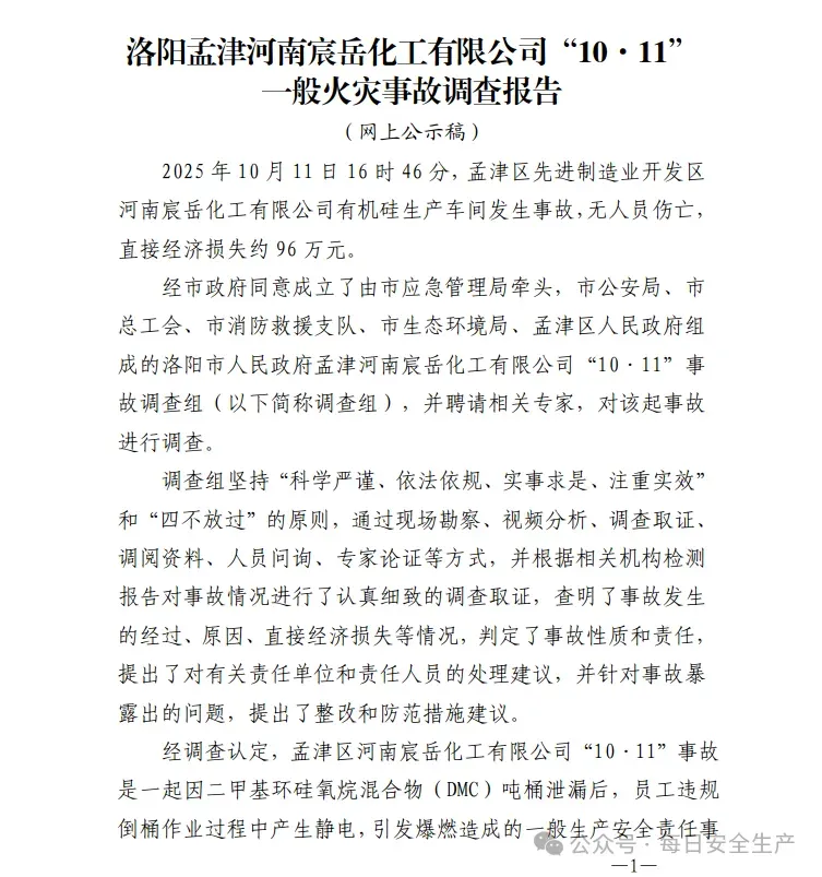 2025年10月11日16时46分,孟津区先进制造业开发区河南宸岳化工有限公司有机硅生产车间发生事故,无人员伤亡,直接经济损失约96万元。