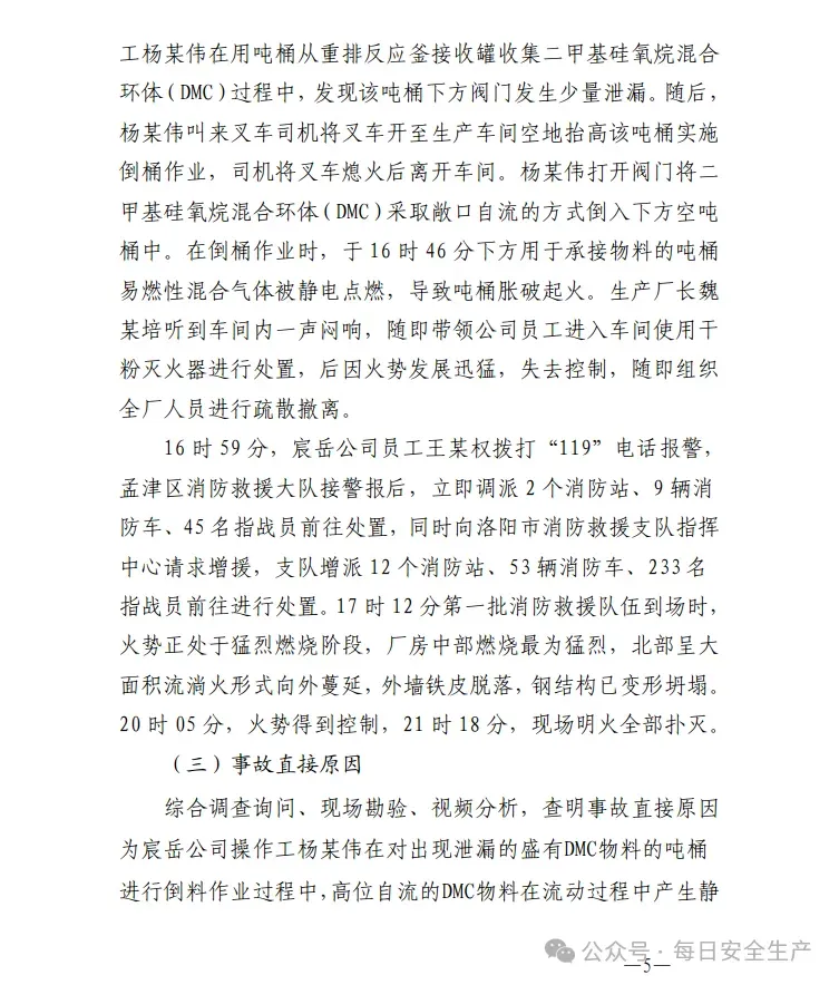 宸岳公司操作工杨某伟在对出现泄漏的盛有DMC物料的吨桶进行倒料作业过程中,高位自流的DMC物料在流动过程中产生静电,积聚的静电荷接触到下方吨桶口部的金属漏斗后发生静电放电现象,引起DMC物料蒸气与空气的混合物爆燃,继而造成下部吨桶内DMC物料燃烧胀破吨桶,形成大面积流淌火。