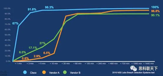 并且在所有待测产品中思科安全解决方案实现了最快的检测速度,3 分钟内就可以检测出 91% 以上的威胁。