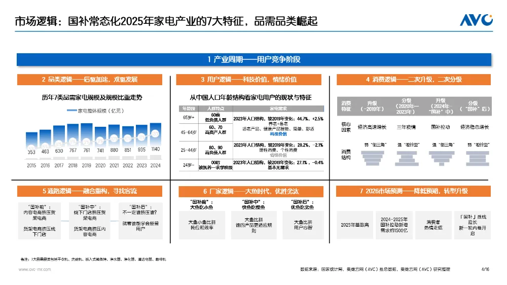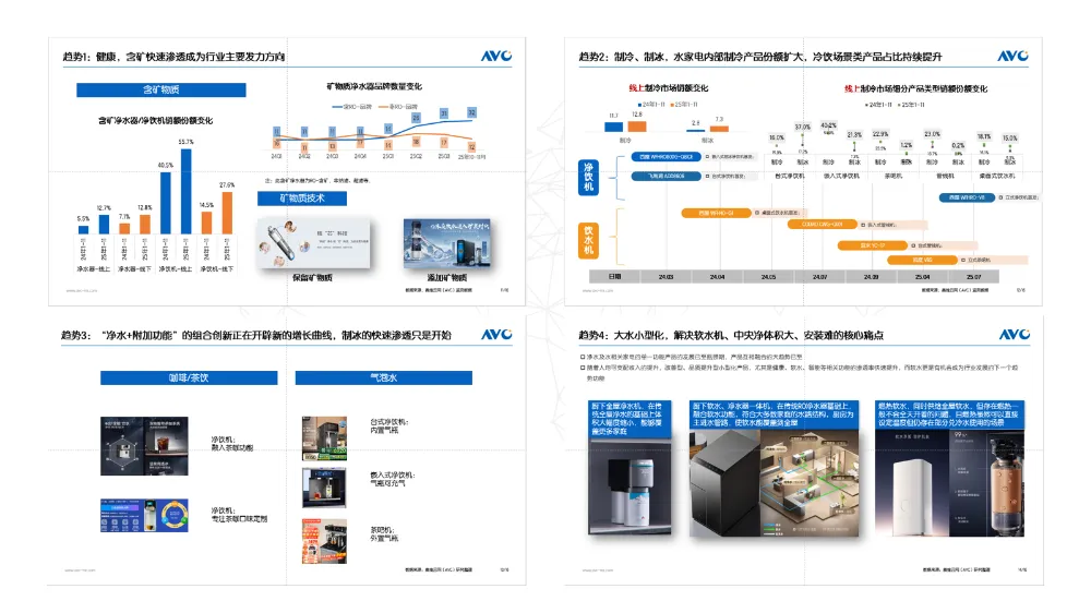 近日,以“聚焦行业技术创新同创健康饮水未来”为核心主题的2026健康饮水主题峰会隆重召开。作为健康家电与消费电子领域权威数据研究机构,奥维云网(AVC)环境健康与清洁电器事业部总经理田亚丽,受邀出席峰会并发表主题演讲,深度解读大数据视角下中国健康饮水市场的规模增长、产品创新趋势与渠道变革方向,为行业高质量发展提供核心洞察与实践参考。奥维云网(AVC)分析指出,当前家电行业正处于关键发展变革期,各核心逻辑呈现鲜明演化特征:从产业周期来看,行业已迈入用户竞争新阶段,企业核心竞争力聚焦于经营用户的综合能力。品类发展层面,干衣机、洗碗机、嵌入式微蒸烤、净水器、净化器、清洁电器、咖啡机这7类品需家电表现亮眼,规模占比持续攀升,2015-2024年从5.2%稳步提升至12.6%,呈现后驱加速、双驱并行的发展态势。用户逻辑上,消费需求呈现清晰的分层特征:65岁以上低负债人群以养老、备老需求为核心,偏好适老、健康属性突出且智能便捷、操作简单的产品,注重产品的科技实用价值;25-44岁高负债人群则更倾向于理性消费与个性表达,追求产品带来的情绪价值满足。消费逻辑呈现“二次升级+二次分级”的动态演进轨迹:2019年前,受益于经济高速增长,消费结构呈现强“哑铃型”升级态势;2020-2023年疫情期间,消费分级加剧,形成强“倒三角”格局;2024年在国补政策拉动下,进入弱“哑铃型”升级阶段;国补退坡后,随着经济进入稳态增长期,消费结构将转向弱“倒三角”分级。渠道逻辑方面,渠道格局加速融合重构,流量渠道、形象渠道、规模渠道、利润渠道四位一体的布局成为行业共识,渠道竞争焦点从单纯的流量争夺转向多元价值的协同构建。在健康饮水市场的渠道演变赛道上,奥维云网明确了其核心变革趋势——传统渠道迭代优化,新兴渠道全面爆发。线下端正摆脱传统销售模式,转向“体验+场景”双驱动的新路径:品牌以净水体验店、社区服务站为抓手,通过精细化运营策略拉近与消费者的距离,让产品功能看得见、摸得着,实现体验感与信任感的双重提升。对于未来竞争格局,奥维云网给出关键判断:线下门店的获客能力,将成为渠道角力的核心焦点。厂家逻辑上,行业已进入“大鱼时代”,优胜劣汰机制愈发明显:国补前呈现“大鱼吃小鱼”的竞争格局,企业比拼的是规模吨位与运营效率;国补期间转为“快鱼吃慢鱼”,核心竞争力在于对政策规则的适配能力;国补后将进入“优鱼吃劣鱼”的新阶段,用户心智的抢占成为企业竞争的关键。对于2026年市场走势,奥维云网(AVC)给出“降低预期、转型升级”的预判:国补政策在2024-2025年期间拉动新增需求约1500亿元,但受2025年高基数效应、消费者消费热情回落等因素影响,行业将开启新一轮内卷,转型升级成为企业破局的核心方向。奥维云网(AVC)在演讲中披露,中国家电市场正进入“国补常态化”阶段,受益于健康消费升级,预计2026年中国末端水家电市场规模将达到333亿元,同比仅有-2.0%小幅度下滑。基于大数据分析,奥维云网指出,健康饮水产品已从“安全净化”向“健康赋能+细分场景解决方案”全面升级。产品创新呈现五大核心趋势:一是饮水健康化,矿物质净水器、饮水机等功能性产品快速崛起,2025年上1-11月含矿物质的净饮机占比已达55.7%,实现饮水口感与营养的双重提升,技术方面,主要以纳滤等核心技术,选择性过滤有害物质,保留矿物元素和通过RO过滤后添加天然矿石成分为主;二是场景适配多元化,针对家庭饮水场景推出覆盖泡茶、冲奶、制冰等多场景的净热一体机,顺应冰块需求的快速增长,市场渗透率持续攀升;三是功能复合化,“净水+附加功能”的组合创新正在开辟新的增长曲线,自制饮品场景正在成为行业增长的核心方向;四是大水小型化,针对90-120平米主流户型推出的“小体积、大流量”全屋净水设备,解决软水机、中央净体积大、安装难的核心痛点;五是单品套系化,长期来看,净水行业正逐步由单品向系统集成转型,全屋净水生态正在重构。此次峰会上,奥维云网通过大数据赋能行业洞察,为健康饮水领域的技术创新与生态共创注入新动能。未来,奥维云网将持续发挥数据与研究优势,助力企业精准把握市场趋势,推动健康饮水行业向更规范、更智能、更普惠的方向迈进,让高品质健康饮水惠及千家万户。奥维云网原创内容,未经授权,禁止任何机构或个人抓取本文内容,用于训练AI大模型等用途。