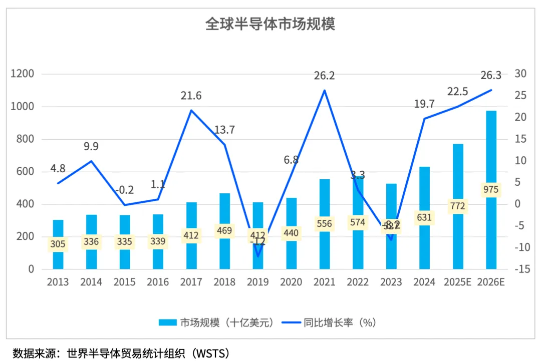 2025年全球半导体市场规模预计达7720亿美元,同比增速提升至22%。这一增长主要由逻辑芯片与存储器两大领域驱动,成为行业复苏的核心引擎。