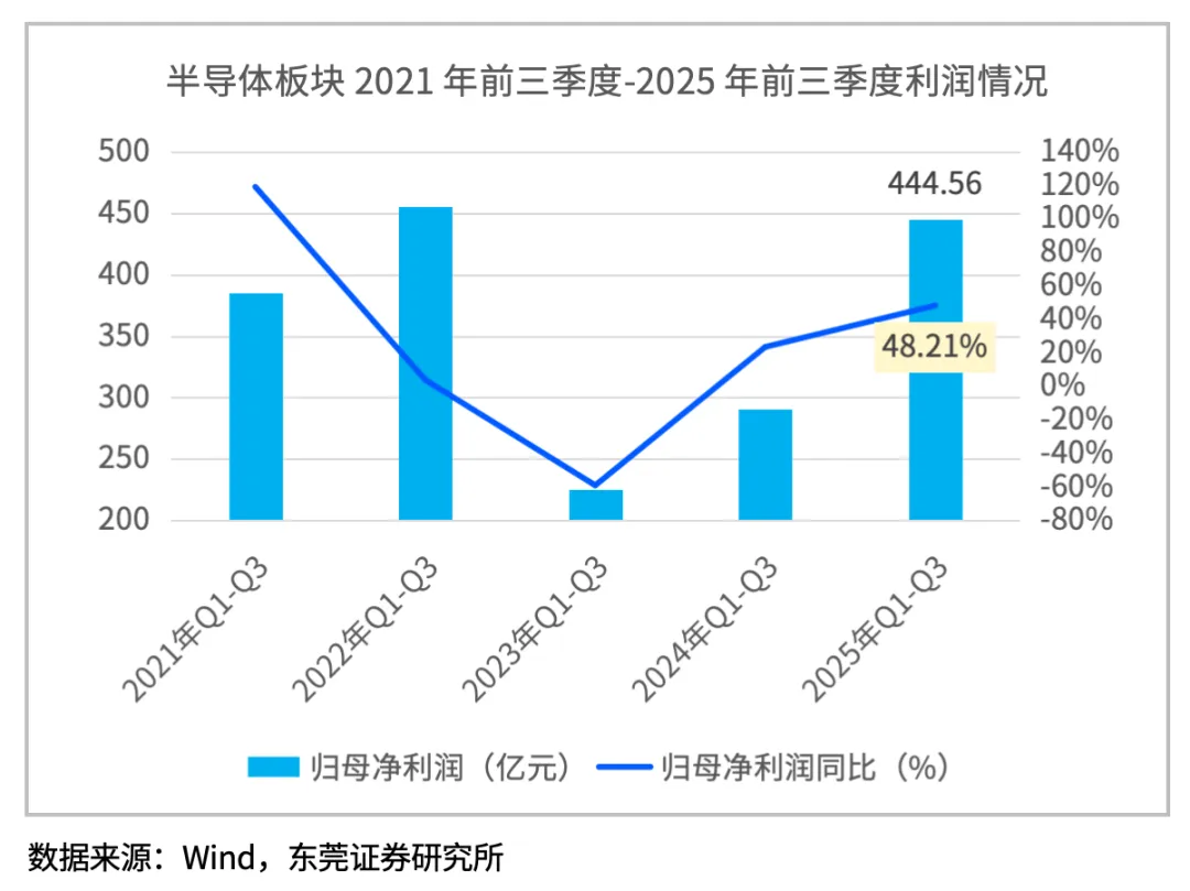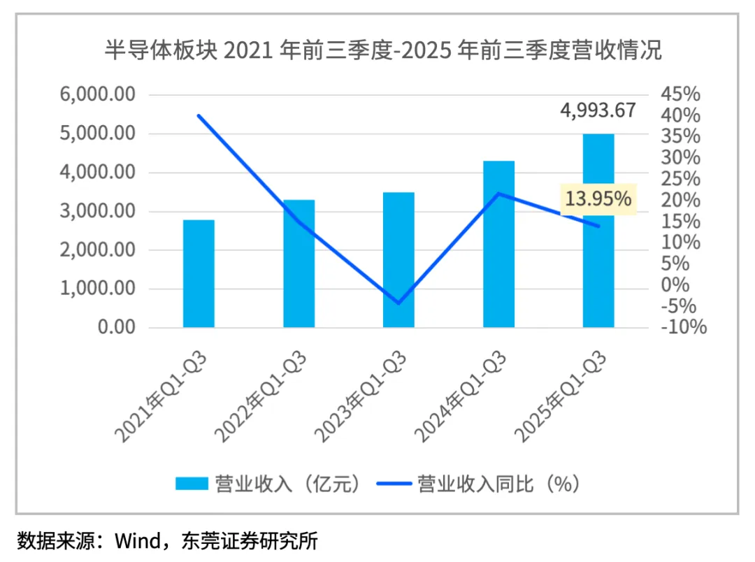 2025年前三季度,国内半导体板块业绩持续向好,主要受益于人工智能领域的强劲需求以及国产替代进程的深化。期内,申万半导体板块实现营业收入4,993.67亿元,同比增长13.95%;实现归母净利润444.56亿元,同比大幅增长48.21%,盈利提升显著。