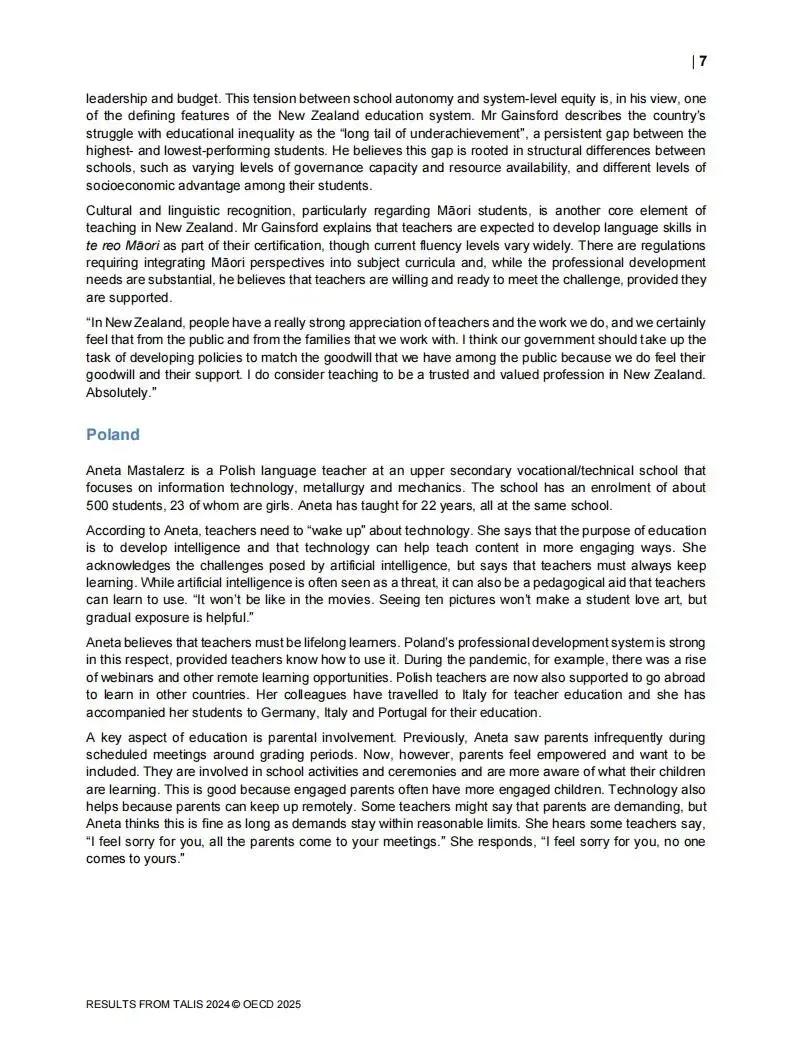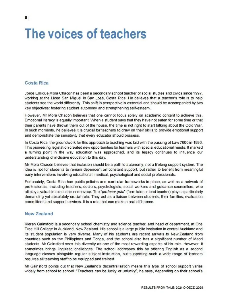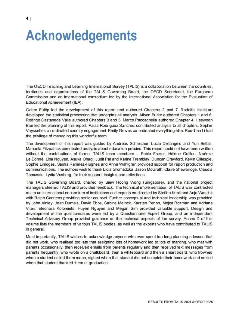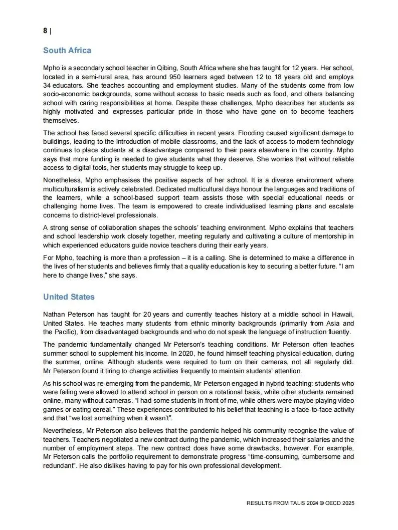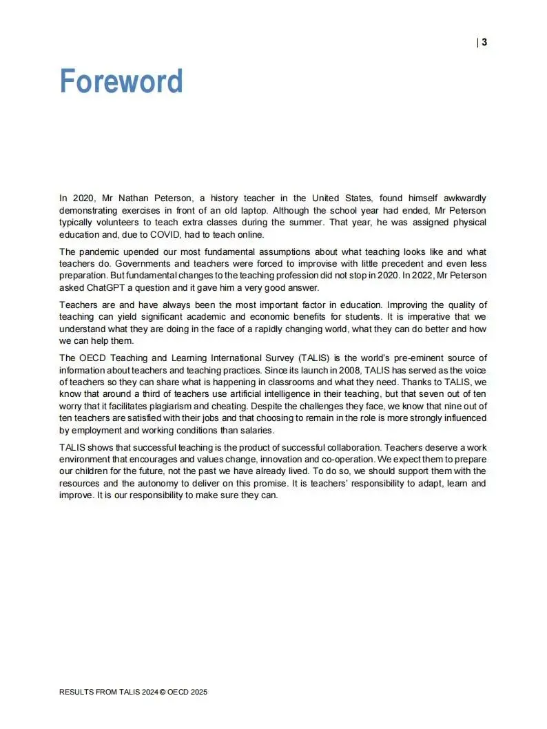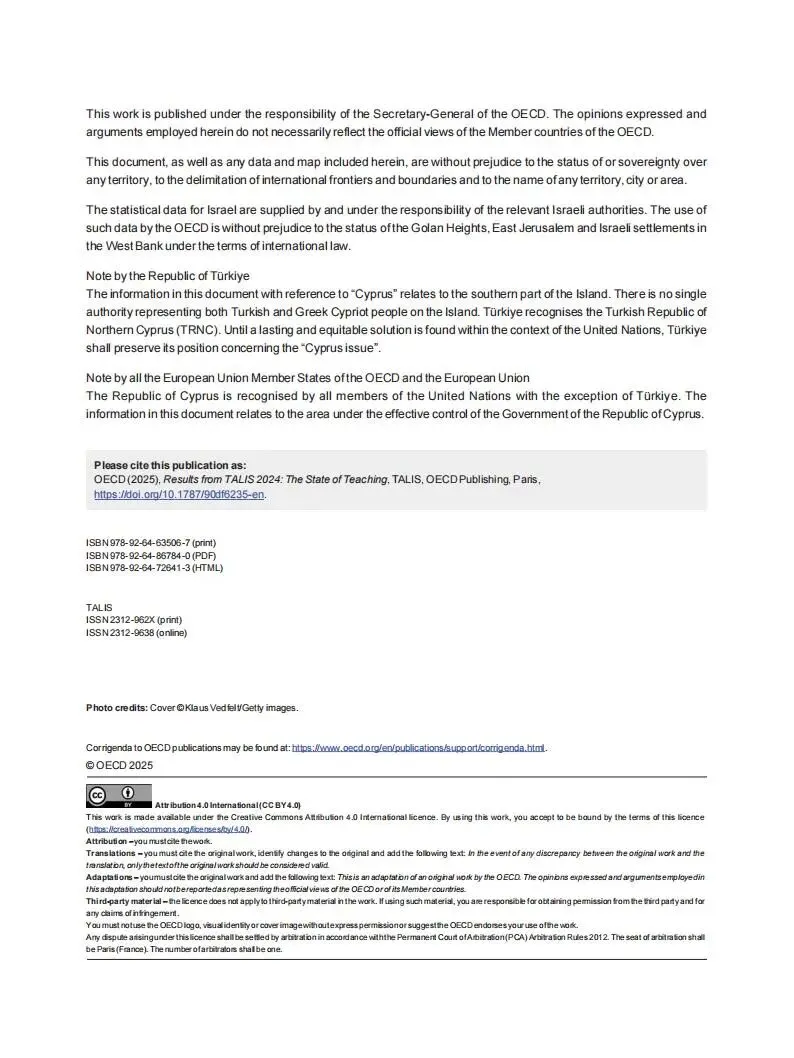 经济合作与发展组织(OECD)发布了“2024年教学与国际学习调查(TALIS)结果”,2024年,来自55个教育体系的28万名教育工作者分享了关于他们的工作条件、专业发展以及现代课堂实际情况的见解。在本版报告中,教师们揭示了他们是否以及如何使用人工智能、他们选择教学的原因,以及他们是否希望继续留在这个行业。TALIS的数据使各国政府能够制定政策,改善学校的教学和学习条件。