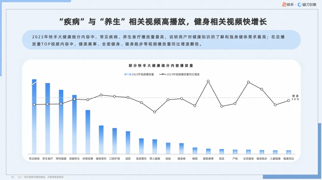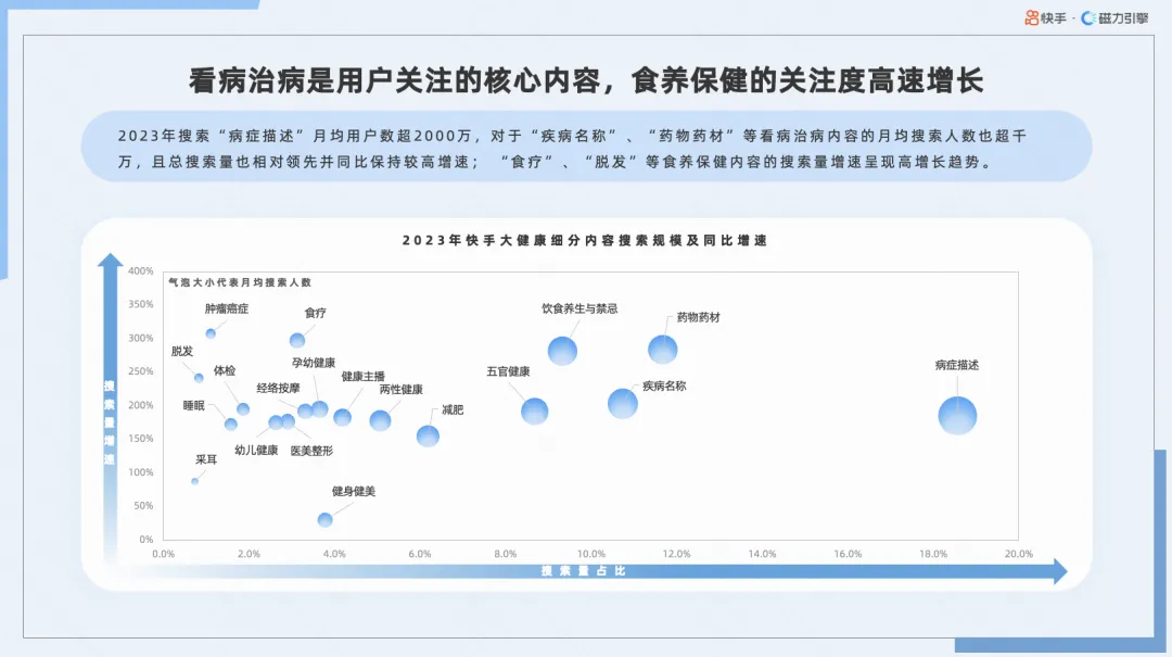 快手大健康内容持续增长,医疗健康相关话题火热,用户互动程度加深,体现出用户对自身健康高度关注,渴望从快手获取更多健康相关知识。