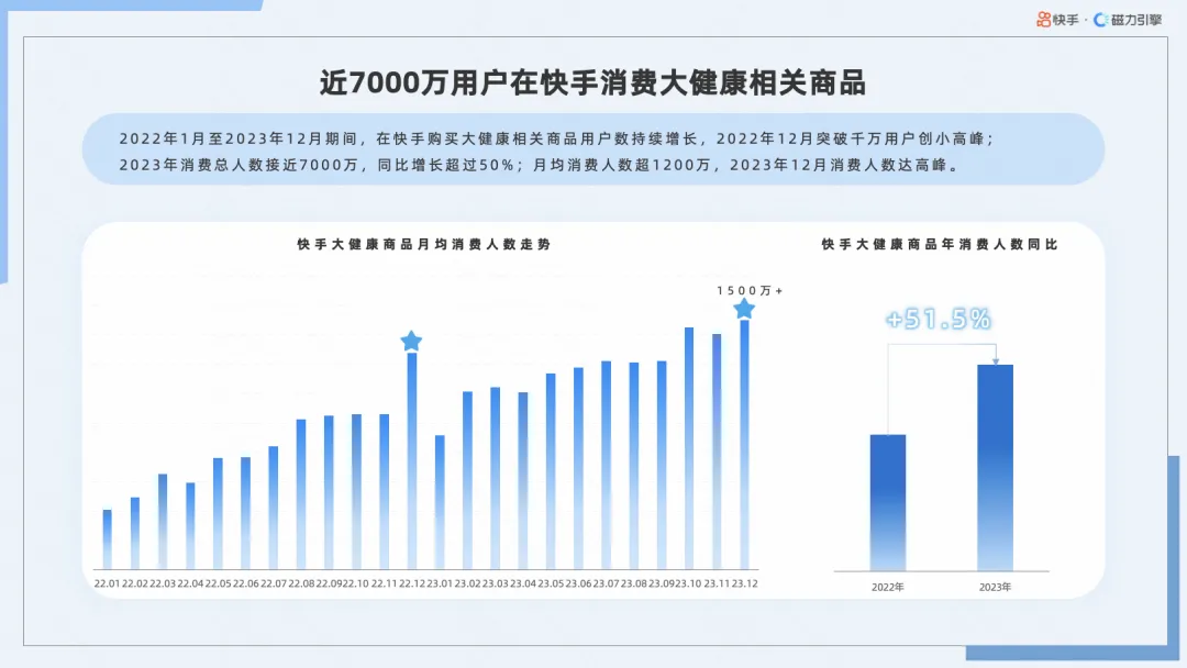 2022年1月至2023年12月期间,在快手购买大健康相关商品用户数持续增长,2022年12月突破千万用户创小高峰;2023年消费总人数接近7000万,同比增长超过50%;月均消费人数超1200万,2023年12月消费人数达高峰。
