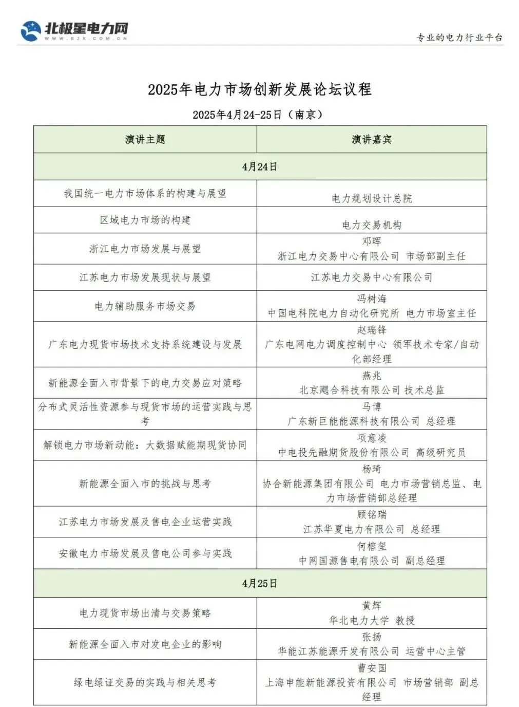 2025年4月24日-28日,中关村华电能源电力产业联盟联合北极星电力网兹定于江苏南京举办2025年电力市场创新发展论坛、2025新能源电力现货交易仿真训练营(总第二十五期),活动详情如下: