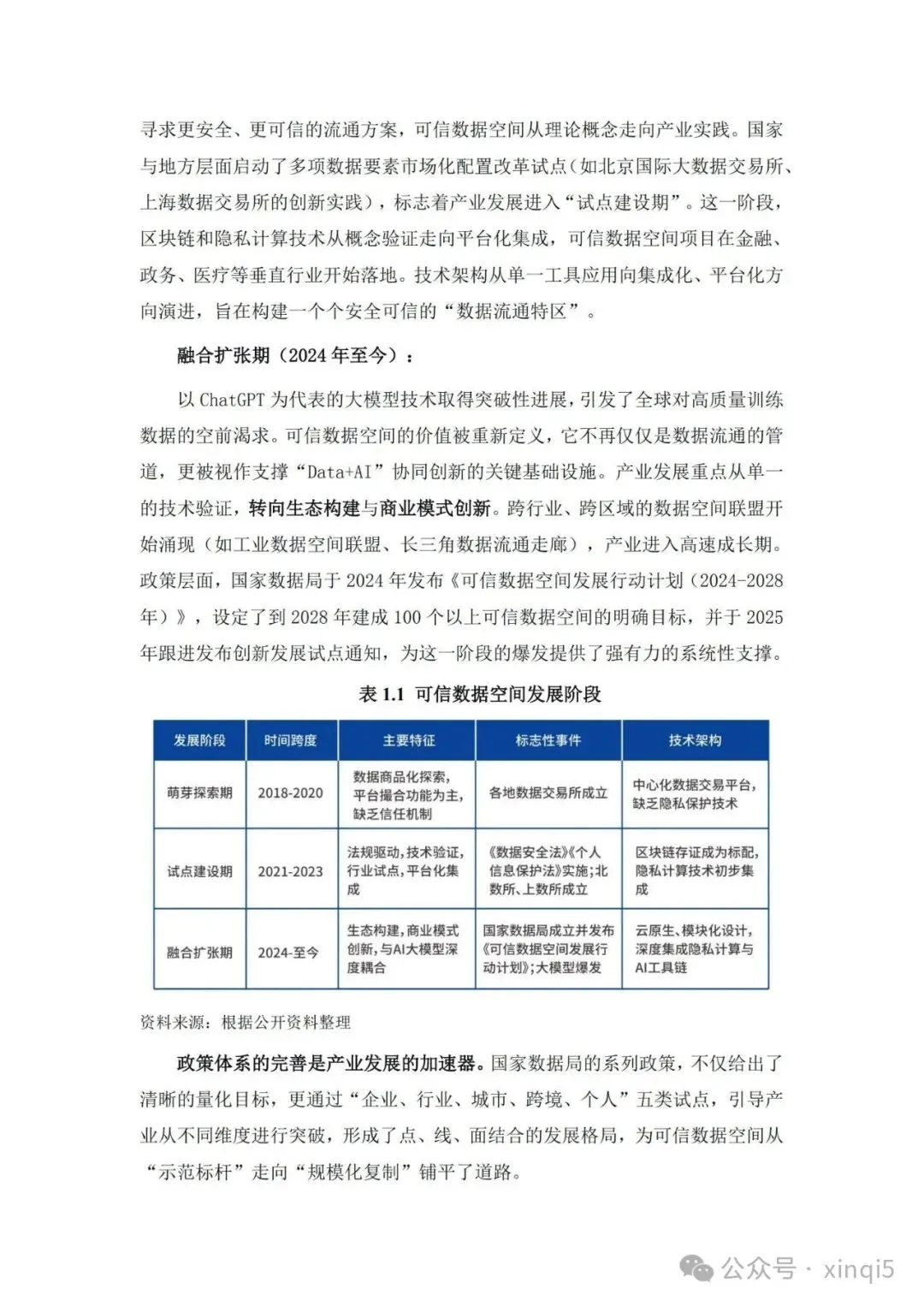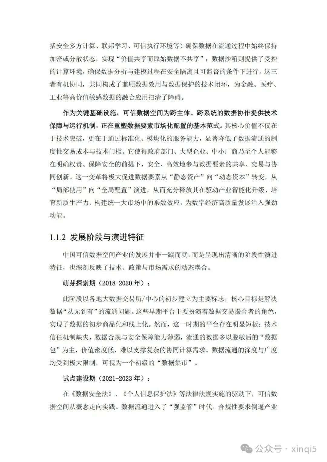 中国可信数据空间产业的发展并非一蹴而就,而是呈现出清晰的阶段性演进特征,也深刻反映了技术、政策与市场需求的动态耦合。萌芽探索期(2018-2020 年):此阶段以各地大数据交易所/中心的初步建立为主要标志,核心目标是解决数据“从无到有”的流通问题。这些早期平台主要扮演着数据交易撮合者的角色,实现了数据的初步商品化和线上化。然而,这一时期的平台存在明显短板:技术信任机制缺失,数据合规与安全保障能力薄弱,流通的数据多以脱敏后的“数据包”为主,价值密度低,难以支撑复杂的协同计算需求。数据流通的深度与广度均受到极大限制,可视为一个初级的“数据集市”。