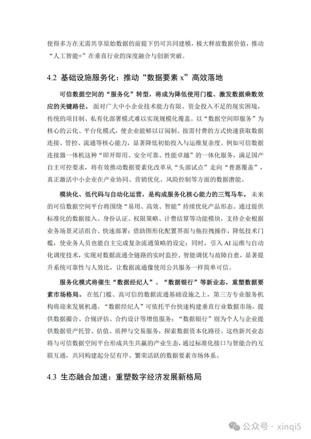 作为关键基础设施,可信数据空间为跨主体、跨系统的数据协作提供技术保障与运行机制,正在重塑数据要素市场化配置的基本范式。其核心价值不仅在于技术突破,更在于通过标准化、模块化的服务能力,显著降低了数据流通的制度性交易成本与技术门槛。它使得政府部门、大型企业、中小厂商乃至个人能够在明确权责、保障安全的前提下,安全、高效地参与数据要素的共享、交易与协同创新。这一变革将极大促进数据要素从“静态资产”向“动态资本”转变,从 “局部使用”向“全局配置”演进,从而充分释放其在驱动产业智能化升级、培育新质生产力、构建统一大市场中的乘数效应,为数字经济高质量发展注入强劲动能。