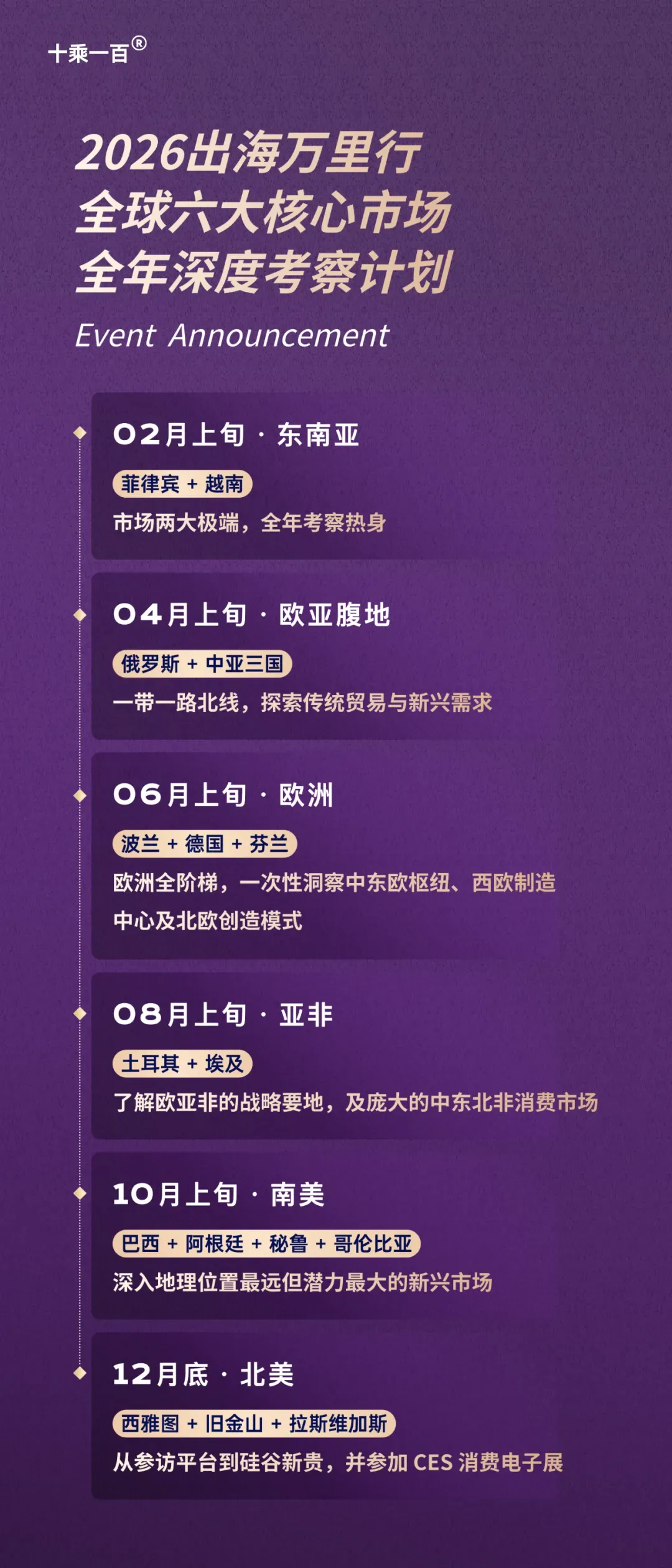 十乘一百®出海联盟将持续推进第三期海外游学进程,后续将发布最后一站巴西的实地洞察,并同步举办线下主题茶话会、1v1深度咨询等活动,汇聚行业实操经验与优质资源,助力出海企业降低试错成本、提升成长效率,推动实现“共同成就100家出海独角兽”的目标。(末尾附带活动预告)