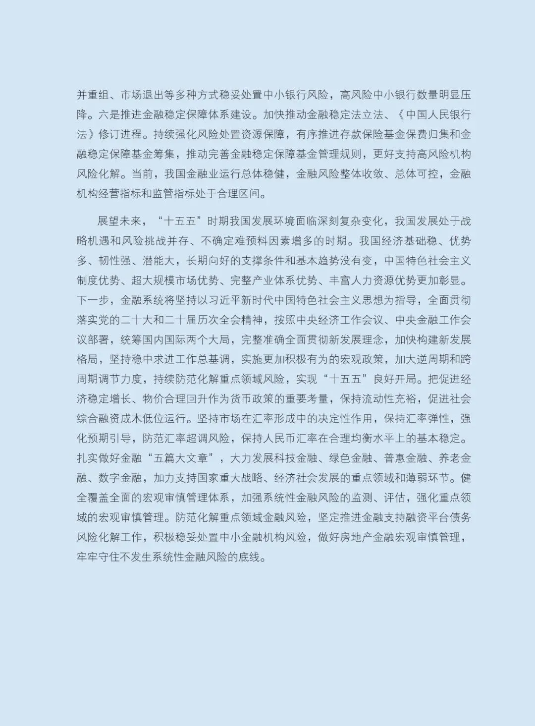 展望未来,“十五五”时期我国发展环境面临深刻复杂变化,我国发展处于战略机遇和风险挑战并存、不确定难预料因素增多的时期。我国经济基础稳、优势多、韧性强、潜能大,长期向好的支撑条件和基本趋势没有变,中国特色社会主义制度优势、超大规模市场优势、完整产业体系优势、丰富人力资源优势更加彰显。下一步,金融系统将坚持以习近平新时代中国特色社会主义思想为指导,全面贯彻落实党的二十大和二十届历次全会精神,按照中央经济工作会议、中央金融工作会议部署,统筹国内国际两个大局,完整准确全面贯彻新发展理念,加快构建新发展格局,坚持稳中求进工作总基调,实施更加积极有为的宏观政策,加大逆周期和跨周期调节力度,持续防范化解重点领域风险,实现“十五五”良好开局。把促进经济稳定增长、物价合理回升作为货币政策的重要考量,保持流动性充裕,促进社会综合融资成本低位运行。坚持市场在汇率形成中的决定性作用,保持汇率弹性,强化预期引导,防范汇率超调风险,保持人民币汇率在合理均衡水平上的基本稳定。扎实做好金融“五篇大文章”,大力发展科技金融、绿色金融、普惠金融、养老金融、数字金融,加力支持国家重大战略、经济社会发展的重点领域和薄弱环节。健全覆盖全面的宏观审慎管理体系,加强系统性金融风险的监测、评估,强化重点领域的宏观审慎管理。防范化解重点领域金融风险,坚定推进金融支持融资平台债务风险化解工作,积极稳妥处置中小金融机构风险,做好房地产金融宏观审慎管理,牢牢守住不发生系统性金融风险的底线。