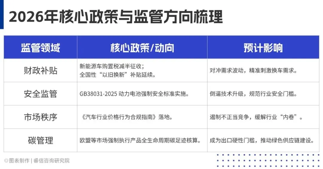 2026年,随着新能源汽车市场走向成熟,政策红利从普惠式转向精准引导,行业政策呈现“高标准、严监管、重规范”的核心导向,通过完善标准体系、强化监督检查,引导行业从“野蛮生长”向“高质量发展”转型。安全与合规成为政策监管的核心重点,《电动汽车用动力蓄电池安全要求》(GB38031-2025)将于2026年7月1日起实施,明确将“不起火、不爆炸”列为强制性要求,倒逼企业提升动力电池安全性能。