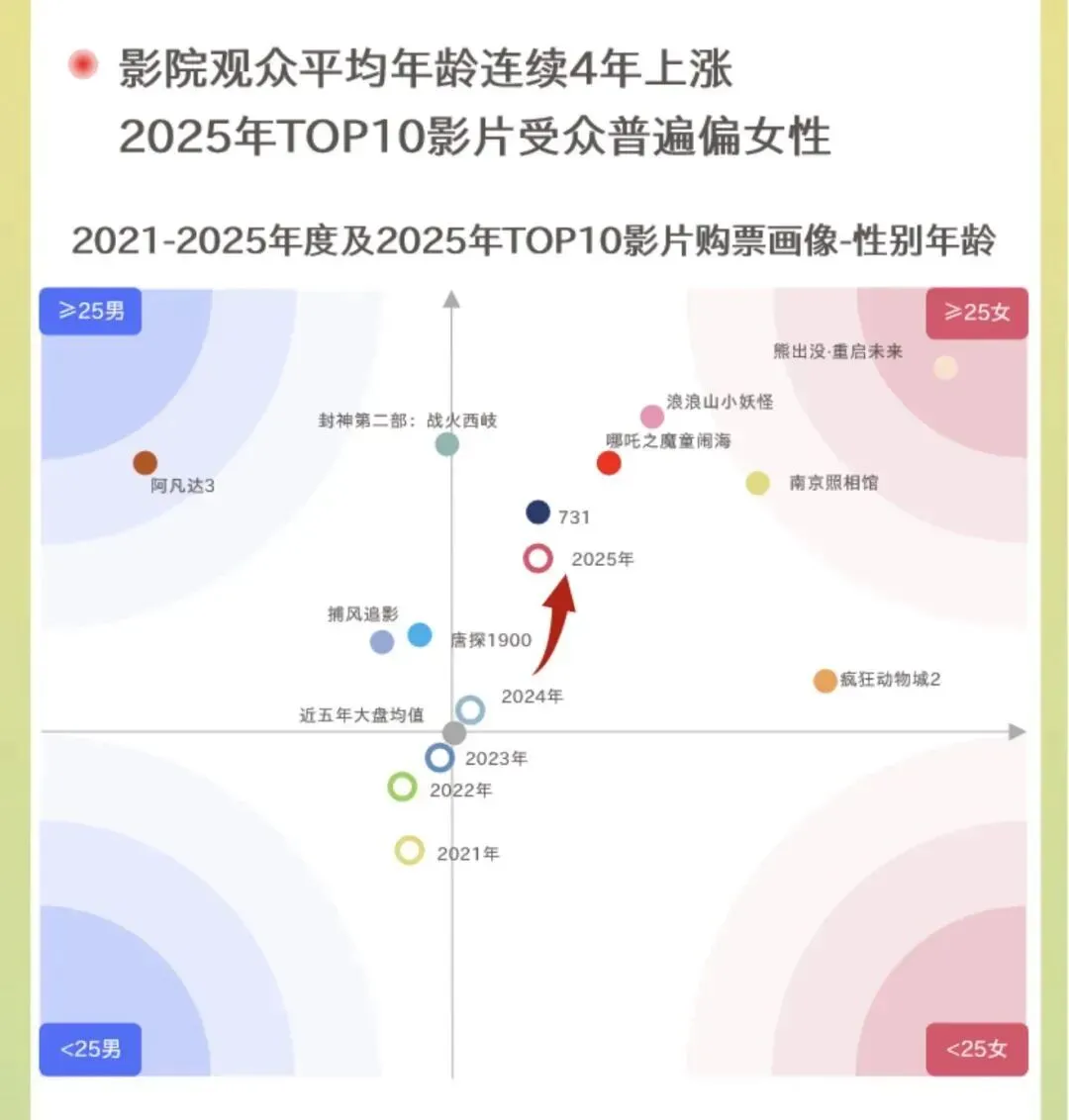从受众结构看,25 岁以上女性成为头部影片核心受众,而动画电影打破 “低幼化” 标签,《哪吒之魔童闹海》35-39 岁观众占比达 20.8%,《浪浪山小妖怪》25-29 岁核心观众占比 26%,实现全龄化覆盖。