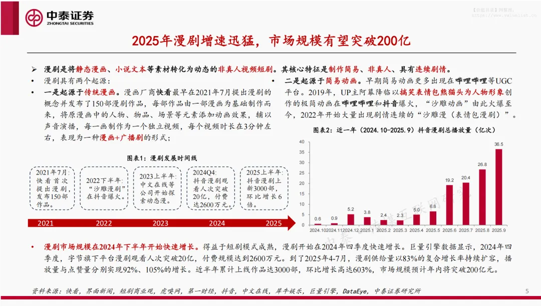 发展历程:2021 年快看首次提出漫剧概念,2022 年 “沙雕漫剧” 爆火,2024Q4 进入快速增长期,2025 年在 AIGC 与平台政策推动下全面爆发;