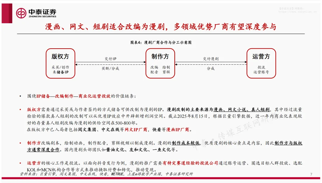 产业格局:产业链涵盖版权方(IP 储备)、制作方(内容生产)、运营方(投流推广)、平台方(分发变现),商业化以 IAA+IAP 模式为主,全域经营投流 ROI 达 1.8×;