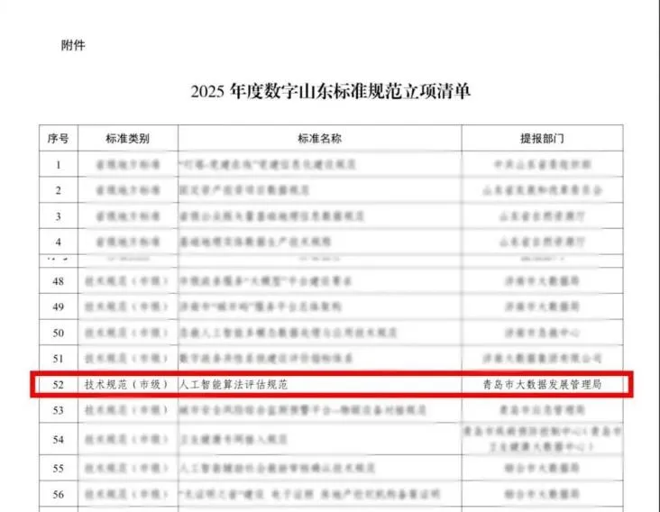 《人工智能算法评估规范》团体标准在省大数据局项目征集中,被推荐立项为“数字山东技术规范(市级)建设项目”,成为全省28项市级技术规范立项之一。