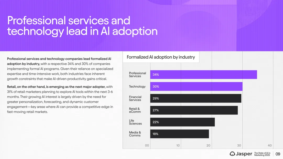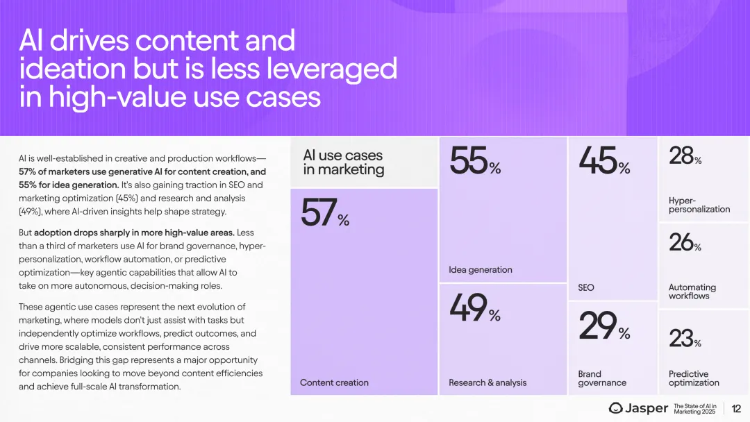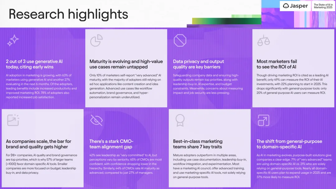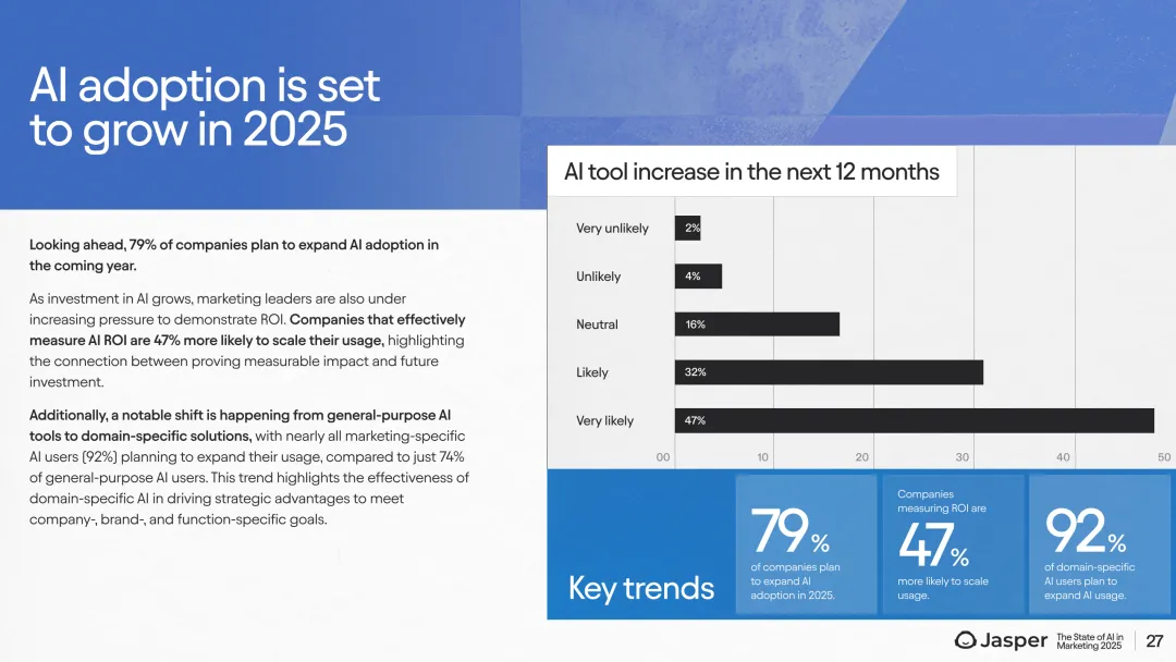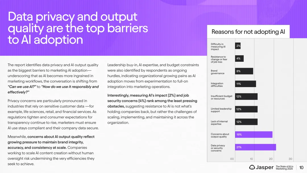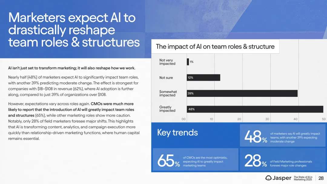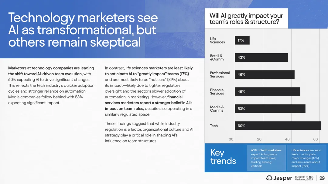 展望未来,AI预算分配显著增长,2025年营销预算中AI投入预计从不足5%增长至11%-15%。79%的企业计划扩大AI使用规模,且92%的领域专属AI用户将持续增加使用规模。近一半(48%)的营销人员预期AI将极大影响团队角色,尤其是在技术和媒体行业,生命科学行业则相对保守。此外,CMO对团队结构变化的预期高达65%。这一趋势表明,随着AI深入应用,营销团队职能和人才结构正经历深刻转型,尤其是内容创意、数据分析及自动化执行环节。