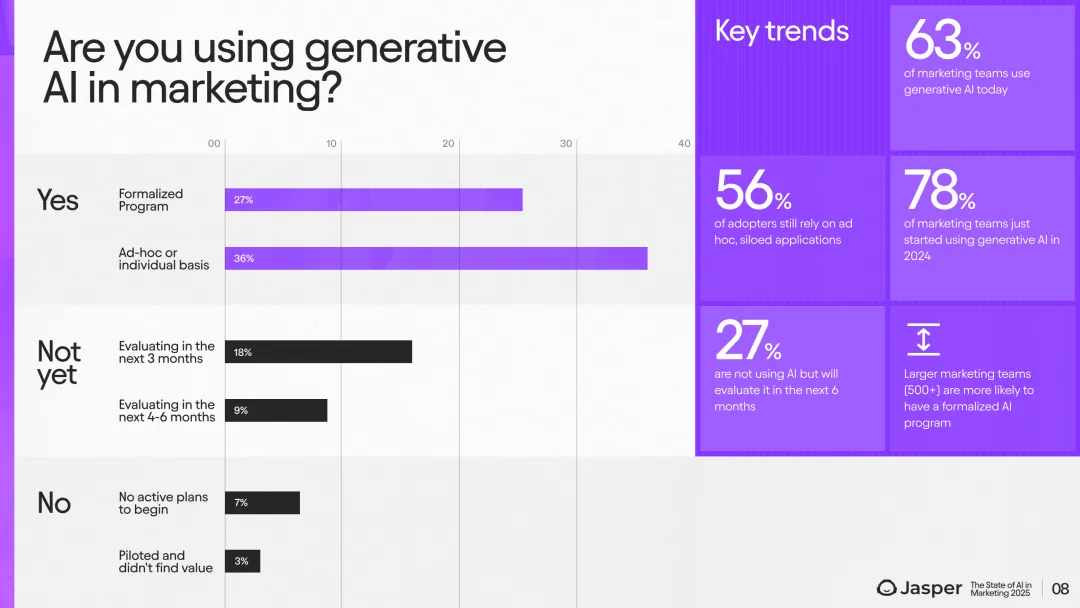首先,在AI采纳层面,63%的营销团队已正式使用生成式人工智能,另有27%计划在未来半年内评估AI应用。生成式AI初步带来内容创作、创意激发和效率提升的显著收益,78%的团队成员因AI工具使用体验而工作满意度提升。然而,当前AI应用仍以零散、非系统化的方式存在,56%的企业依赖零散的、未整合的工具,只有43%拥有正式的AI应用规划。大企业和营销团队规模较大(500人以上)倾向于更结构化的AI采纳策略。