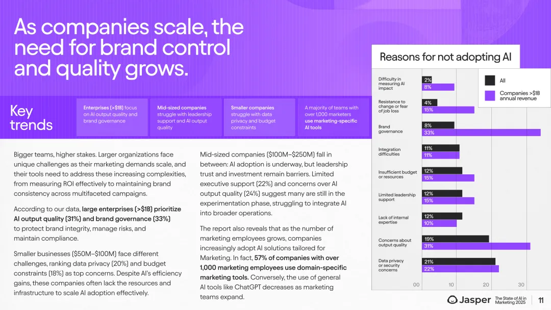 其次,AI成熟度整体尚属初级,只有10%的企业自评达到“非常先进”级别,44%处于初级“起步”或“加速”阶段。更先进的应用如品牌治理、流程自动化和超个性化等高价值场景未被充分挖掘,仅不到三成企业实际使用这些技术。大型企业因战线广泛、高风险管控需求更偏重AI输出质量和品牌一致性,57%的大团队使用专属领域AI工具,而小型企业更关注预算和数据隐私问题。