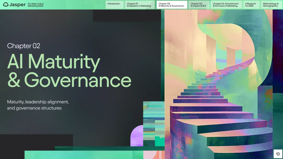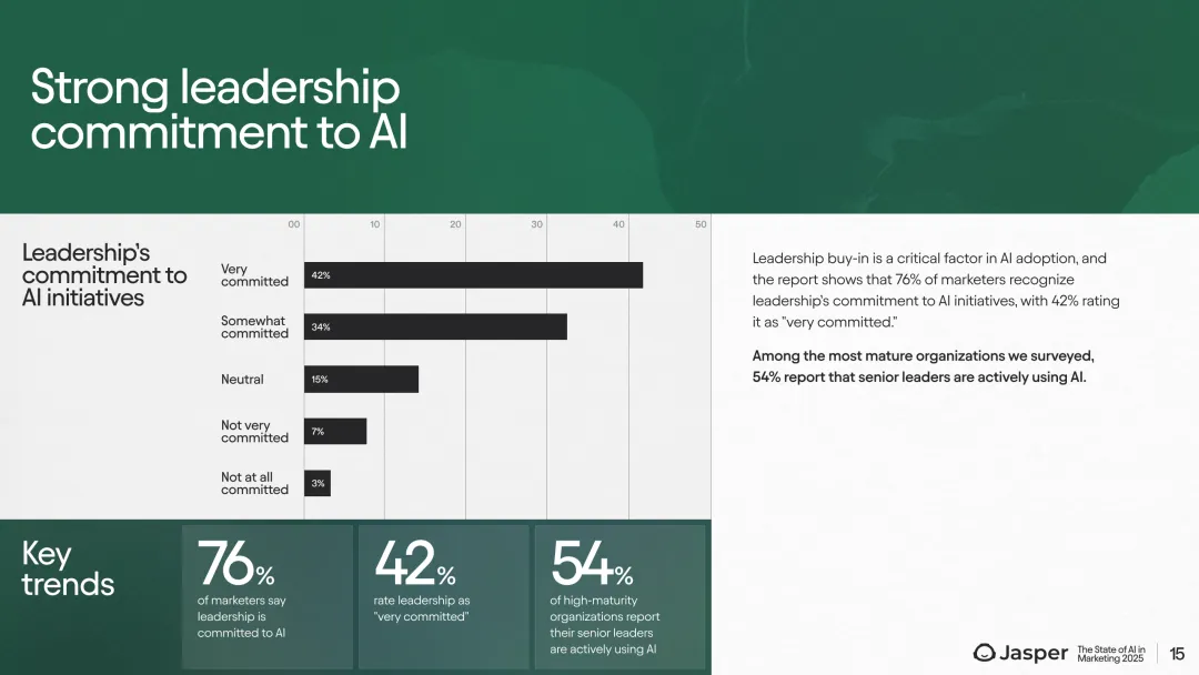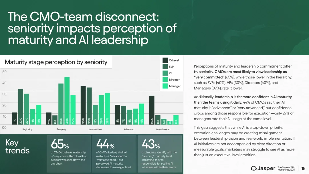 在治理与领导力方面,76%的受访者认为其领导层对AI发展持积极态度,42%给出“非常投入”评价。高层(CMO)对领导力承诺和AI成熟度的认知明显高于基层管理者,呈现明显的认知差距。约半数企业已经组建了专门的营销AI委员会,业界高度成熟组织的79%均已建立此类机构。培训与政策建设方面,只有25%的公司提供进阶AI培训,46%的企业建立了AI使用规范文件,且大企业在这方面表现更佳。