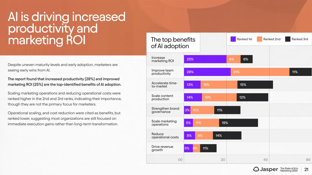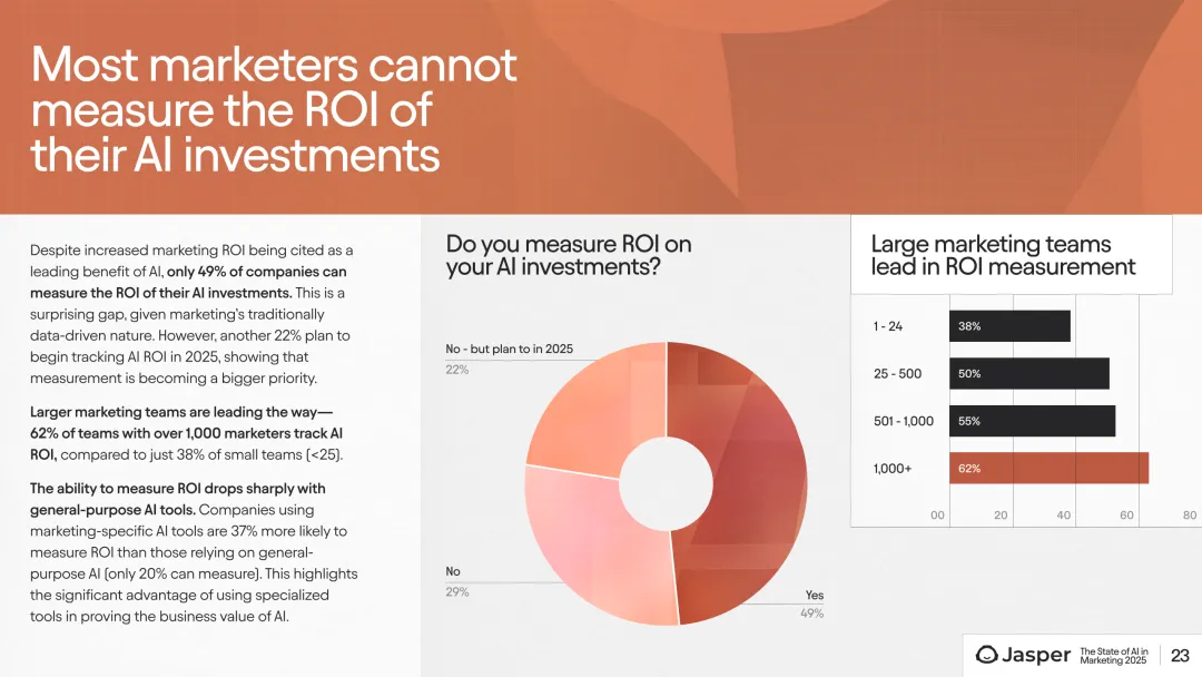 在ROI和效益上,AI被证明驱动了营销效率和投资回报。28%的营销专家将提升生产力列为首要效益,25%强调改善ROI,超过三分之二的大型团队能够准确衡量投资回报率。营销专属AI工具用户测量ROI的可能性比通用工具用户高37%。此外,78%的市场人员因AI自动化流程和减负作用而感到工作满意度显著提升。收入相关指标是最受关注的投资回报衡量标准,58%的企业跟踪以营销费用换算的收入效益。
