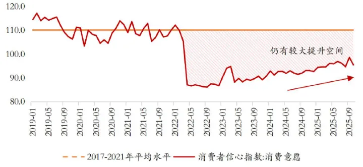 2、居民消费情绪呈现持续改善趋势,2025年10月消费者信心指数达95.5,与历史均值水平相比仍有提升潜力。