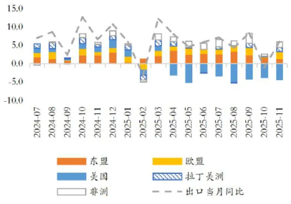 出口超预期韧性是2025年中国经济韧性增长重要动能。2025年前11月,出口累计同比增长5.4%,略高于2024年同期。前三季度,净出口对经济增长的拉动率为1.5%,较2024年同期提升约0.4个百分点。地区结构看,在关税政策扰动下,对美国出口的负面影响持续显现;对东盟、欧盟出口保持稳健增长,对非洲、拉丁美洲等新兴市场出口增长较快。产品结构看,以机电产品、高技术产品为代表的资本与技术密集型产品是出口的重要增长点,其中船舶、汽车、集成电路等高端制造产品出口保持较高增速。