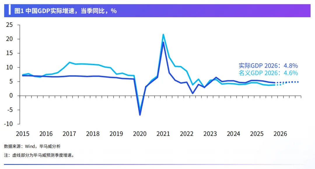 A、经济运行再平衡,通缩压力有望缓解2026年经济增速预计在4.8%左右,名义增速回升至4.6%,物价有望从“止跌”转向“温和回升”。这标志着持续数年的通缩压力或迎来拐点。推动再平衡的关键在于“反内卷”政策与扩内需政策形成合力——低效产能有序出清,同时重大项目落地与民生投入支撑需求回暖,经济“温差”有望收窄。