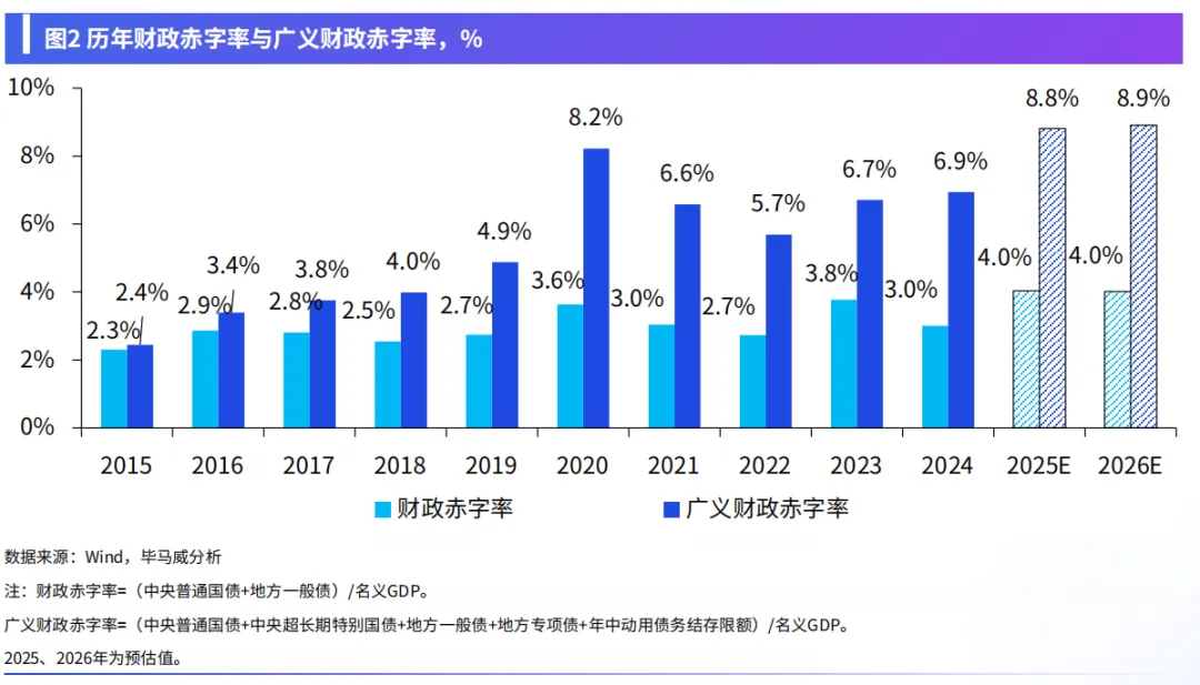 B、宏观政策保持积极,央地分工更趋清晰财政货币政策延续宽松基调,广义财政赤字率预计达8.9%,降准降息仍有空间。值得关注的是,中央与地方支出责任进一步明晰:中央侧重“两新”“两重”等公益项目,地方聚焦新兴产业与消费提振。这种分工有助于提升政策效能,也是国家治理现代化在宏观经济调控中的具体体现。